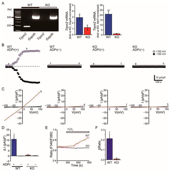 In isolated atrial myocytes, intracellular ADPr (ADPr, 0.5 mM) elicited a time-dependent whole-cell current in WT cells, whereas currents remained minimal in WT cells dialyzed without ADPr and in TRPM2−/− cells irrespective of ADPr (Figure 1B). The ADPr-evoked current showed an approximately linear I–V relationship (Figure 1C). The increase in current density (ΔI) was significantly larger in WT + ADPr than in the other three conditions, which were near baseline (Figure 1D, p < 0.05). Consistently, exposure to H2O2 increased fura-2 ratios in WT atrial myocytes, whereas responses were markedly blunted in TRPM2−/− cells (Figure 1E,F, p < 0.05).