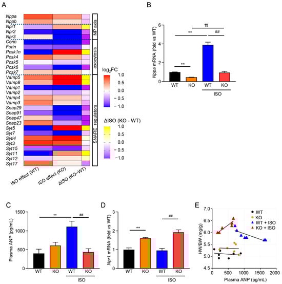 TRPM2 deficiency blunts the atrial ANP program under ISO. (A) Focused heatmap of ANP/secretory–exocytosis genes (Nppa, Nppb, Npr1–3, Corin, Furin/Pcsk family, Vamp/Snap/Syt) across WT, KO, WT + ISO, KO + ISO. Values are row-wise z-scores of log2(TPM + 1); genes are clustered by Euclidean distance. ISO effect (WT) = log2FC (WT + ISO vs. WT); ISO effect (KO) = log2FC (KO + ISO vs. KO); ΔISO (KO − WT) = ISO effect (KO) − ISO effect (WT). (B) qPCR of Nppa (ANP) mRNA in atria (relative to WT) (mean ± SEM, n = 5). (C) Plasma ANP by ELISA (mean ± SEM, n = 6–7). (D) Atrial Npr1 (NPR-A) expression (mean ± SEM, n = 5). (E) Correlation between plasma ANP and HW/BW. Linear least-squares fits of HW/BW (mg·g−1) vs. plasma ANP (pg·mL−1): WT, y = −1.0 × 10−4 x + 5.14; WT + ISO, y = −5.0 × 10−4 x + 6.43; KO, y = −4.0 × 10−5 x + 5.36; KO + ISO, y = 1.0 × 10−3 x + 5.83. (B–D) Statistical testing: one-way ANOVA with Tukey’s post hoc test. ** p < 0.01 WT vs. WT + ISO; ¶¶ p < 0.01 KO vs. KO + ISO; ## p < 0.01 WT + ISO vs. KO + ISO.