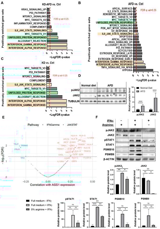 Because our a priori hypothesis was that arginine deprivation would induce tumor-microenvironment-dependent transcriptional responses in cancer cells, we next examined which pathways were consistently altered across all three modes of arginine starvation. This analysis highlighted the interferon-Janus kinase-signal transducer and activator of transcription (JAK-STAT) axis as the most recurrently and significantly enriched pathway, aligning with the expected TME-driven response pattern. The main enriched pathways included interferon-alpha (IFN) and gamma (IFNγ) signaling, as well as, to a lesser extent, IL6-JAK-STAT3 signaling (Figure 2A–C, Tables S1 and S6). Interferon signaling is mediated by activation of Janus kinase 2 (JAK2) [15]. Indeed, Western blot analysis of 4T1 tumors following an AFD confirmed the elevation in JAK2 phosphorylation and total protein levels (Figure 2D). In concordance with the elevation in IFNγ response following depletion of arginine, further analysis of the cancer cells’ scArg-screen data revealed an elevation in canonical downstream targets of IFNγ-JAK2-STAT1, including genes of the immunoproteasome (IP) subunits and genes related to antigen presentation (Figure S3A–C). Accordingly, we further examined the expression of key components of these IFN-γ-regulated pathways, including major histocompatibility complex class I (MHC-I) and the IP subunits proteasome subunit beta type-9 (PSMB9/LMP2) and proteasome subunit beta type-10 (PSMB10/MECL-1), as functional readouts of IFNγ pathway activation [16,17]. Specifically, we confirmed by flow cytometry analysis the elevation in MHC-I expression in ASS1-KD + AFD tumors (Figure S3D).