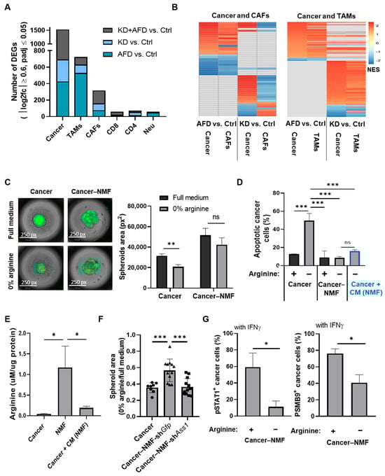 CAF-derived arginine supports cancer cell survival but does not rescue IFNγ-JAK-STAT signaling. (A) Bar graph shows the number of DEGs in each TME cell type from the scArg-screen, indicating similar transcriptomic effects following cancer-endogenous and systemic inhibition of arginine availability. DEGs were determined using 12 pseudo-samples per treatment as described in the Methods Section. (B) Heatmaps show GSEA-enriched pathways (p ≤ 0.05) shared between cancer cells and CAFs (left) or cancer and TAMs (right), based on the scArg-screen. In each graph, the pathways shown in the 2 columns on the left compare AFD vs. Ctrl, and the 2 columns on the right compare KD vs. Ctrl. Full data is provided in Table S3. (C) Representative images (left) and quantification (right) of GFP+ 4T1 cells co-cultured with NMFs demonstrate preserved spheroid size in arginine-deprived conditions. n = 3. Four spheroids were averaged for each replicate. Student’s t-test. p-value: 0.003. (D) Flow cytometry of annexin-V staining shows reduced apoptosis in 4T1 cells co-cultured with NMFs or treated with conditioned medium of NMFs. n = 3. One-way ANOVA and Tukey tests. *** p-value < 0.001. (E) LC-MS analysis shows elevated arginine levels in NMF medium compared to cancer cell medium or to medium of cancer cells treated with CM from NMF. Values were normalized to total protein mass. n = 3; one-way ANOVA and Tukey tests. p-values: 0.29 and 0.32, respectively. (F) Quantification of spheroids’ area of 4T1 monoculture (4T1) or 4T1 co-cultured with NMFs expressing shGfp (NMF-shGfp) or shAss1 (NMF-shAss1). Preserved spheroid growth under arginine-deprived conditions was observed only when 4T1 cells were co-cultured with NMFs expressing Ass1. (n = 3; four spheroids analyzed per replicate. One-way ANOVA and Tukey tests. *** p-value < 0.001. (G) Flow cytometry shows reduced pSTAT1+ (left) and PSMB9+ (right) cancer cells co-cultured with NMFs under arginine deprivation, indicating fibroblasts do not rescue IFNγ signaling under arginine deprivation. n = 3. Student’s t-test. p-values: 0.011 and 0.005, respectively. ns—not significant, * p < 0.05; ** p < 0.01; *** p < 0.001.