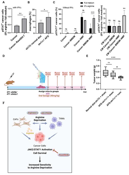 Cancer–CAF–TAM crosstalk drives JAK-STAT activation under arginine deprivation, revealing therapeutic vulnerability in TNBC. (A) Flow cytometry shows elevated IFNγ-induced pSTAT1+ cancer cells (0% arginine/full medium) when co-cultured with RAW264.7 macrophages. n = 3. Student’s t-test. p-value: 0.006. (B) Flow cytometry shows increased CD45+CD11b+F4/80+ macrophages in tumors of KD + AFD mice vs. Ctrl. n = 5. Student’s t-test. p-value: 0.043. (C) Flow cytometry analysis of pSTAT1+ cancer cells shows increased pSTAT1 activation under arginine deprivation when 4T1 cells are co-cultured simultaneously with BMDMs and NMFs (left) or when treated with CM derived from this tri-culture (right). No external IFNγ was added. For each experiment: n = 3, 2-way ANOVA with Tukey’s tests comparing full vs. 0% arginine within each co-culture/CM condition (p = 0.001 and p = 0.0054, respectively). (D) Schematic overview of experimental design: BALB/c female mice were injected with 4T1-shGfp or 4T1-shAss1 (ASS1-KD) cells. On day 11, mice were divided into 2 groups: mice fed with a regular or arginine-free diet (AFD) and treated by gavage with ruxolitinib (40 mg/kg). Created in Biorender. Tishler, H. (2025) https://BioRender.com/v7fnfh3. (E) Tumor weights show enhanced response to arginine deprivation when mice are treated with ruxolitinib. n = 6–7. One-way ANOVA test. p-value < 0.0001 and 0.021, respectively. (F) Proposed model: Arginine depletion in tumor cells elicits a compensatory response mediated by the tumor microenvironment. CAFs support cancer cells by supplying arginine, and cooperative interplay among cancer cells, CAFs, and TAMs activate JAK-STAT signaling to sustain cancer cell survival. This acquired dependency sensitizes tumors to JAK1/2 inhibition with ruxolitinib, offering a strategy to overcome resistance to arginine-depleting agents such as ADI-PEG20 and Arginase-I. Created in Biorender. Tishler, H. (2025) https://BioRender.com/cyfg4aa. ns—not significant, * p < 0.05; ** p < 0.01; *** p < 0.001.