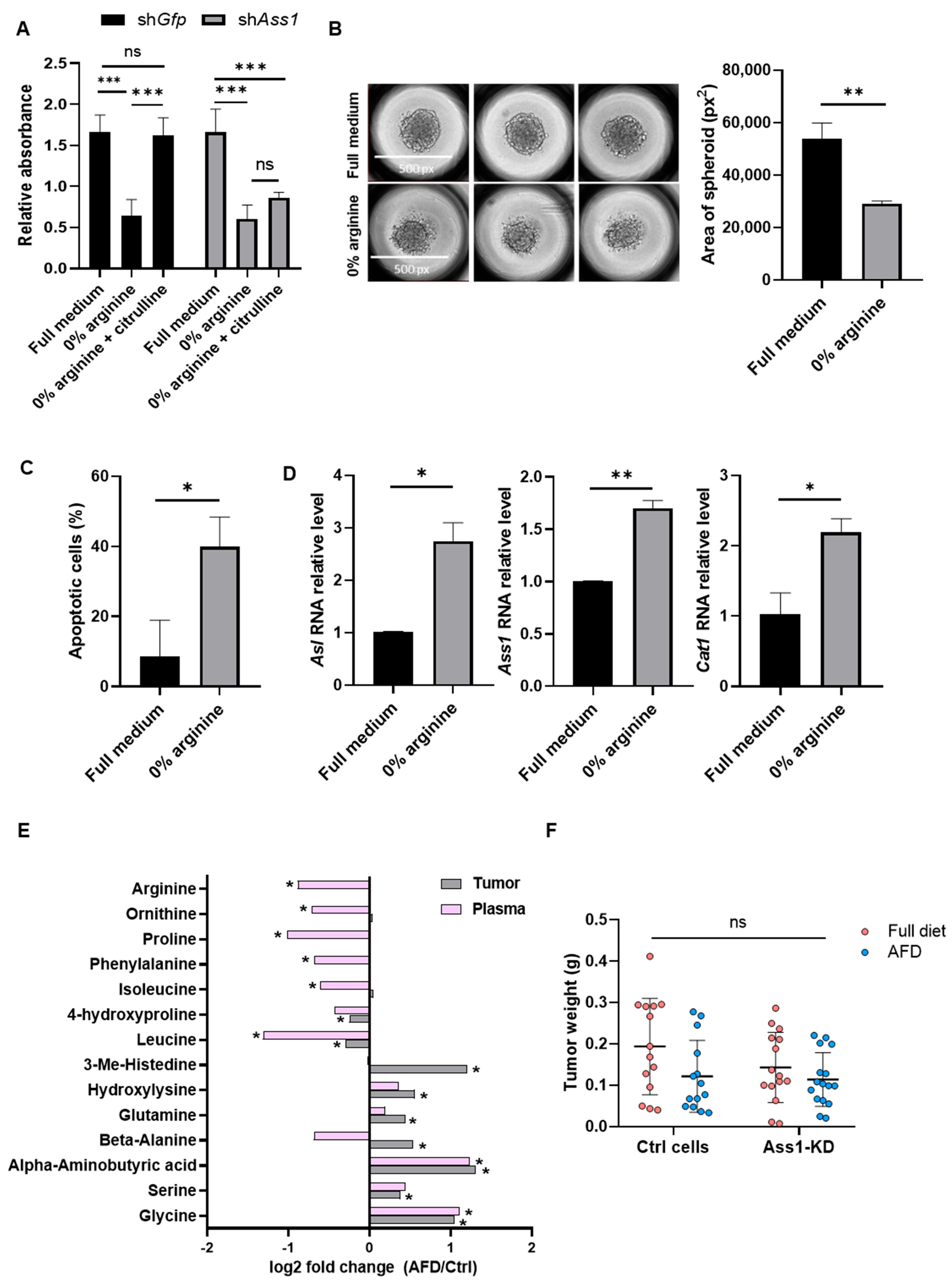 We first validated the essentiality of arginine for 4T1 cells by culturing ASS1-downregulated and -expressing cells in an arginine-depleted Plasmax medium. We found that arginine depletion reduced 4T1 cell survival, while supplementation with the ASS1 substrate citrulline rescued survival only in ASS1-expressing 4T1 cells, confirming their reliance on ASS1 for arginine synthesis and on arginine for survival (Figure 1A, and Figure S1A and S2A). We further validated the essential role of arginine in 4T1 survival by showing restricted growth and increased apoptosis in 3D spheroids cultured in arginine-depleted Plasmax medium (Figure 1B,C). As expected, arginine deprivation induced compensatory responses in 4T1 cells, including increased expression of Ass1, Asl, and the cationic amino acid transporter 1 (Cat1), a key arginine transporter (Figure 1D) [14]. However, these compensatory mechanisms were insufficient to sustain cell survival.
