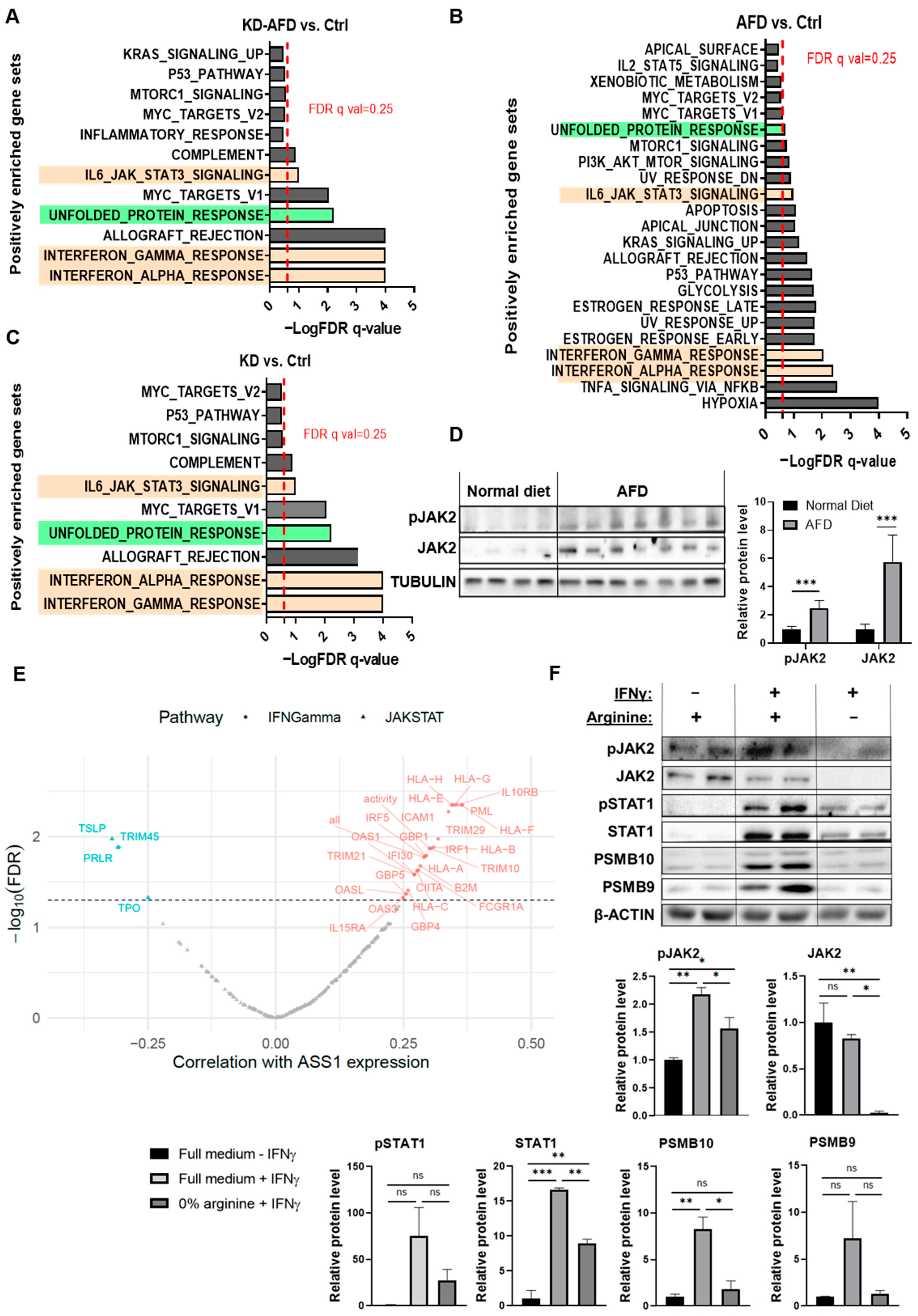 Arginine deprivation activates IFNγ/JAK-STAT in vivo despite in vitro suppression. (A–C) Pathway enrichment of Hallmark gene sets of KD + AFD vs. Ctrl (A), AFD vs. Ctrl (B), and KD vs. Ctrl. (C) Shows upregulation of unfolded protein response (green) and IFNγ/JAK-STAT signaling (light orange) in cancer cells from the single-cell RNA sequencing following different modes of arginine restriction (scArg-screen). BALB/c female mice were inoculated with 4T1-shGfp or 4T1-shAss1 cells and fed with a standard diet or an AFD. Tumors of 4–5 mice from each group were pooled together. Red line = FDR q-value threshold of 0.25. (D) Western blot (left) and its quantification (right) of pJAK2 and JAK2 expression in tumors from mice fed with a standard diet (n = 4) or an AFD (n = 7) on day 7 after tumor inoculation. Student’s t-test. *** p-value < 0.001. (E) Spearman correlations in TCGA-TNBC tumors show a correlation between ASS1 and IFNγ/JAK-STAT genes. Red = positive correlation; blue = negative correlation. Significant genes (FDR < 0.05) are colored; “all” and “activity” reflect gene average and estimated activity by single-sample gene set enrichment analysis (ssGSEA), respectively. Full data are provided in Table S2. (F) Western blot (upper) and its quantification (lower) show IFNγ-induced JAK-STAT-PSMB9-10 expression in 4T1 spheroids only in the presence of arginine. n = 2 replicates. The experiment was repeated 3 times. Student’s t-test. ns—not significant, * p < 0.05; ** p < 0.01; *** p < 0.001.