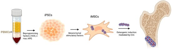 Recent studies have shown that EVs derived from different stem cell sources, such as BM-MSCs, ADSCs, UC-MSCs, and dental or synovial stem cells, exhibit heterogeneous molecular profiles and distinct osteogenic capacities [16,17,18]. Several studies have demonstrated that BMSC-EVs play a crucial role in bone formation by transporting specific miRNAs, making them a promising therapeutic strategy for bone metabolic disorders [19]. Compared to MSCs obtained from bone marrow or other tissues, ADSCs offer several notable benefits. In fact, these cells are easier to obtain and to collect; they are more plentiful, and their isolation involves reduced donor-site injury [20]. In addition, UC-MSCs-EVs are particularly attractive for therapeutic applications because they can be obtained non-invasively from discarded clinical specimens, exhibit rapid proliferation, display low immunogenicity, and avoid ethical concerns [21]. Moreover, through the use of gene reprogramming technology, adult cells can be reprogrammed into iPSCs, a unique cell population that can undergo dedifferentiation, in order to differentiate into specific cells including osteoblasts (Figure 3) [22,23]. EVs from iPSCs and iPSC-derived MSCs (iMSCs) represent a novel approach for regenerative medicine [24]. Several other tissue-specific stem or progenitor cells have been investigated for their ability to generate osteoinductive EVs. These include dental pulp stem cells (DPSCs), periodontal ligament stem cells (PDLSCs), and synovial mesenchymal stem cells (SYN-MSCs) [25,26,27,28,29,30,31,32,33].