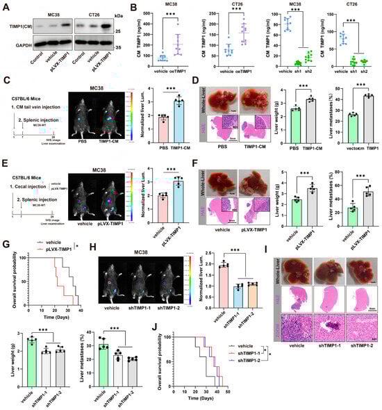 For functional assays in C57BL/6 mice, we infused protein-normalized, BCA-matched conditioned medium through the tail vein on day 1. Each dose contained 100 μg total protein in 100 μL per mouse, and TIMP1-CM delivered 50 ± 8 ng TIMP1 per dose by ELISA with endotoxin below 0.1 EU/mL. Protein-matched vector-CM and PBS served as controls. On day 7, wild-type MC38 cells were injected intrasplenically. On day 28, bioluminescence imaging quantified hepatic colonization, and livers were harvested for H&E to verify and measure metastatic burden. Mice preconditioned with TIMP1-CM showed higher liver bioluminescence, increased liver weight, and a greater percentage of metastatic involvement compared with vector-CM or PBS, indicating that CRC-derived TIMP1 preconditions the liver to support metastatic outgrowth (Figure 2C,D). We next asked whether sustained tumor-intrinsic TIMP1 production promotes metastasis from an orthotopic site. Using a cecal implantation model with vehicle- or pLVX-TIMP1-transduced MC38 cells, followed by splenic injection of MC38-WT cells, enforced TIMP1 expression markedly increased liver bioluminescence, liver weight, and the percentage of metastatic involvement, and significantly shortened overall survival (Figure 2E–G). Conversely, knockdown of TIMP1 using two independent shRNA constructs (shTIMP1-1 and shTIMP1-2) significantly reduced liver metastatic burden and tumor-associated liver enlargement (Figure 2H,I). Survival analysis demonstrated that TIMP1 knockdown significantly prolonged the overall survival of tumor-bearing mice compared to vehicle-treated controls (Figure 2J), indicating that TIMP1 plays a critical role in promoting CRLM and contributes to poor prognosis.