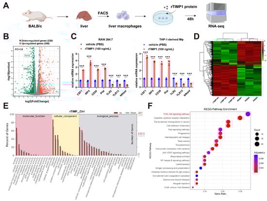 TIMP1 stimulation reprograms liver macrophage gene expression. (A) Schematic of the experimental design: Liver macrophages isolated from BALB/c mice were treated with recombinant TIMP1 (rTIMP1, 100 ng/mL) for 48 h, followed by RNA sequencing. (B) Volcano plot showing differentially expressed genes between rTIMP1-treated and control macrophages (fold change > 1.5, adjusted p < 0.05). Red: upregulated genes (n = 308); green: downregulated genes (n = 230); gray: non-significant. Selected genes are labeled. (C) qPCR validation of representative genes in RAW264.7 and THP-1-derived macrophages treated with rTIMP1 or vehicle (PBS). Data represent mean ± SEM (n = 3). *** p < 0.001, unpaired two-tailed Student’s t-test. (D) Heatmap showing hierarchical clustering of differentially expressed genes in rTIMP1-treated and control groups. (E) Gene Ontology (GO) enrichment analysis of upregulated (red) and downregulated (green) genes in the categories of molecular function, cellular component, and biological process. (F) KEGG pathway enrichment analysis of differentially expressed genes. Size of the bubbles represents gene count; color indicates adjusted p-value. Key pathways including PI3K-Akt, cytokine–cytokine receptor interaction, and JAK-STAT signaling are enriched in the rTIMP1-treated group.