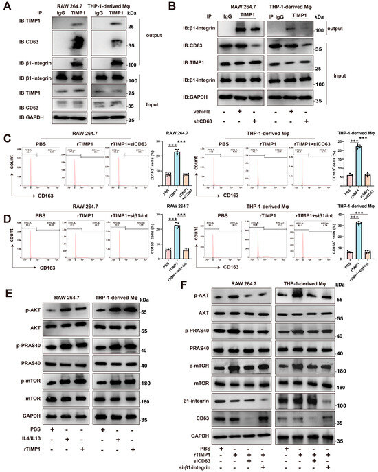 TIMP1 binds to CD63/β1-integrin on macrophages and activates the AKT/mTOR pathway. (A) Co-immunoprecipitation (Co-IP) showing the interaction between TIMP1 and CD63/β1-integrin in RAW264.7 and THP-1-derived macrophages. Cell lysates were immunoprecipitated with anti-TIMP1 or control IgG and immunoblotted for CD63, β1-integrin, and TIMP1. (B) Reverse Co-IP using anti-β1-integrin confirms the formation of a TIMP1-CD63-β1-integrin complex. (C,D) Flow cytometric analysis of CD163+ macrophages after treatment with PBS, rTIMP1, rTIMP1 + siCD63, or rTIMP1 + si-β1-integrin. Quantification of CD163+ cell percentages is shown (right). (E) Western blot analysis of p-AKT, p-PRAS40, and p-mTOR in macrophages treated with PBS, rTIMP1, or rTIMP1 + IL4/IL13. (F) Knockdown of CD63 or β1-integrin inhibits TIMP1-induced activation of the AKT/mTOR signaling pathway. GAPDH was used as a loading control. Data are presented as mean ± SEM from at least three independent experiments. Statistical significance: *** p < 0.001.