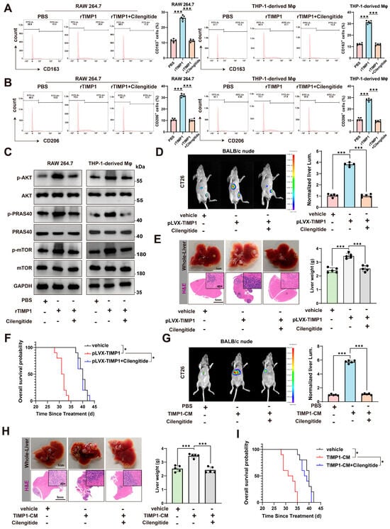 Cilengitide blocks the TIMP1/CD63/β1-integrin/mTOR axis and inhibits M2-macrophage-mediated CRLM. (A) Flow cytometry of CD163+ macrophages in RAW264.7 and THP-1–derived macrophages treated with PBS, recombinant TIMP1 (rTIMP1 100 ng/mL), or rTIMP1 plus Cilengitide 5 μM for 24 h; quantification on the right. (B) CD206+ macrophages measured as in (A) under the same treatments and timing. (C) Immunoblot of p-/total AKT, PRAS40, and mTOR in RAW264.7 and THP-1–derived macrophages after 24 h of PBS, rTIMP1 100 ng/mL, or rTIMP1 + Cilengitide 5 μM; GAPDH, loading control. (D) Orthotopic model in BALB/c nude mice with CT26: representative IVIS images and quantification of normalized liver luminescence showing enhanced metastatic burden with pLVX-TIMP1 and its suppression by Cilengitide. Cilengitide 5 mg/kg, i.p., in 200 μL every 3 days from day −1 to endpoint. (E) Corresponding whole-liver photos and H&E images (dashed lines, metastatic areas) with liver-weight quantification for the groups in (D). (F) Kaplan–Meier overall survival for vehicle, pLVX-TIMP1, and pLVX-TIMP1 + Cilengitide. (G) Validation using TIMP1-conditioned medium (TIMP1-CM) with CT26: representative liver IVIS images and quantification for PBS, TIMP1-CM, and TIMP1-CM + Cilengitide. One intravenous dose of CM on day 1, protein-matched across groups, 100 μg total protein in 100 μL per mouse; TIMP1 50 ± 8 ng per dose by ELISA; PBS as vehicle. Cilengitide 5 mg/kg, i.p., every 3 days starting day −1. (H) Gross liver and H&E images with liver-weight quantification for the groups in (G). (I) Kaplan–Meier overall survival for PBS, TIMP1-CM, and TIMP1-CM + Cilengitide. Data represent mean ± SEM. Statistical analysis: one-way ANOVA or log-rank test; * p < 0.05, *** p < 0.001.