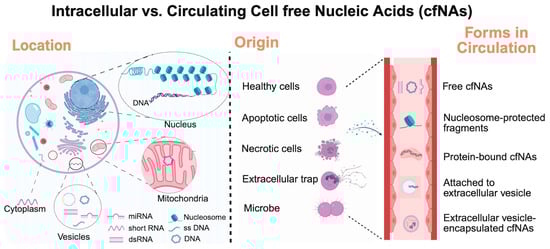 CfNAs originate from both healthy and diseased cells and are released into circulation and other biofluids [22]. Unlike intracellular NAs, cfNAs are present in the extracellular compartment as short fragments that are either (1) bound to proteins (e.g., nucleosomes for DNA; ribonucleoproteins for RNA) or (2) encapsulated in extracellular vesicles (EVs), such as exosomes, microvesicles, or apoptotic bodies [27,28]. These structural contexts protect cfNAs from degradation and make them morphologically and biophysically distinct from cellular NAs (Figure 1).
