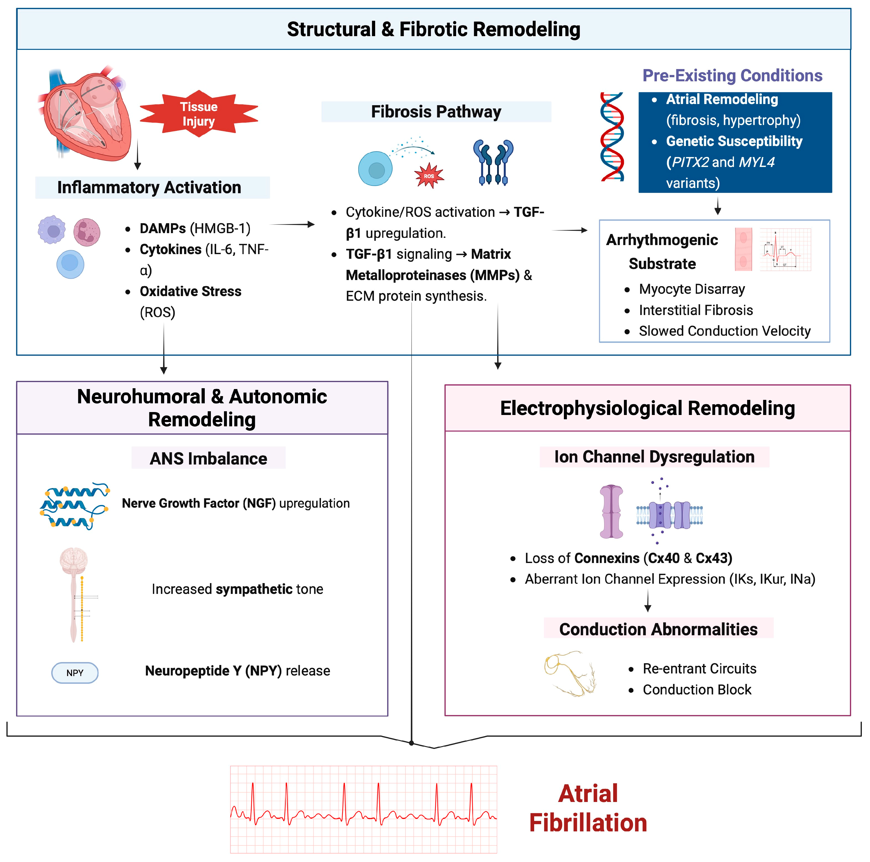 Figure 1. Mechanisms of atrial fibrillation: structural, neurohumoral, and electrophysiological remodeling. Created in BioRender. Mylavarapu, M. (2025) https://BioRender.com/5nc7afi (accessed on 20 December 2025).