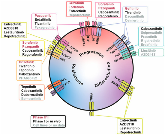 Involvement of receptor tyrosine kinases (RTKs) in tumour-associated processes in neuroblastoma (NB) cells. RTKs are positioned based on their involvement in three processes: NB progression (red), differentiation (purple), and drug resistance (blue). Inhibitors are written in three colours, indicating their stage of NB research: phase II/III (red), phase I or in vivo studies (black), and cell lines or no data (grey).