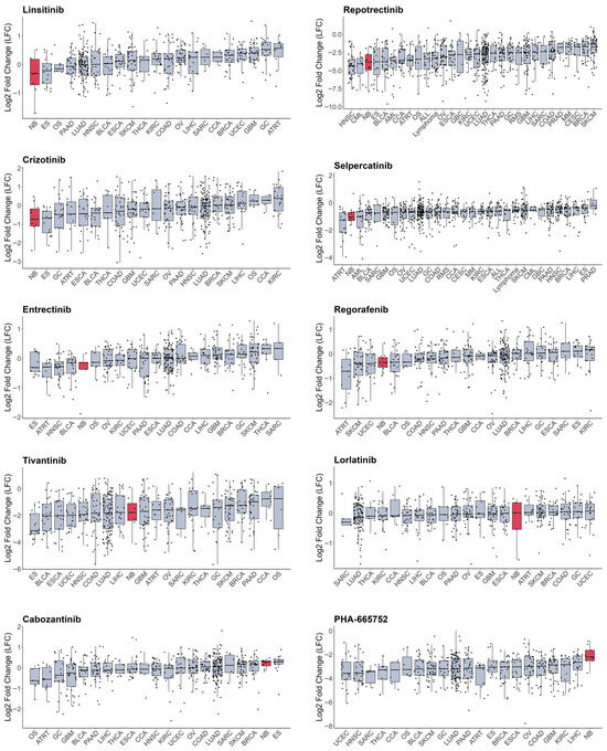 Cell number change in log2 after treatment with RTK inhibitors from PRISM database. Cell lines grouped by primary tumour type, neuroblastoma cells marked in red. Median values and lower and upper quartile are shown; each dot represents a cell line. CCA—cholangiocarcinoma, BLCA—bladder urothelial carcinoma, BRCA—breast invasive carcinoma, OS—osteosarcoma, CESC—cervical squamous cell carcinoma and endocervical adenocarcinoma, COAD—colon adenocarcinoma, UCEC—uterine corpus endometrial carcinoma, ESCA—esophageal carcinoma, ES—Ewing sarcoma, GBC—gallbladder cancer, GC—stomach adenocarcinoma, GBM—glioblastoma multiforme, HNSC—head and neck squamous cell carcinoma, KIRC—kidney renal clear cell carcinoma, LIHC—liver hepatocellular carcinoma, LUAD—lung adenocarcinoma, SKCM—skin cutaneous melanoma, MM—multiple myeloma, NB—neuroblastoma, OV—ovarian serous cystadenocarcinoma, PAAD—pancreatic adenocarcinoma, PRAD—prostate adenocarcinoma, ATRT—atypical teratoid rhabdoid tumour, RMS—rhabdomyosarcoma, SARC—sarcoma, THCA—thyroid carcinoma, CML—chronic myeloid leukaemia, ALL—acute lymphoblast leukaemia, AML—acute myeloid leukaemia.