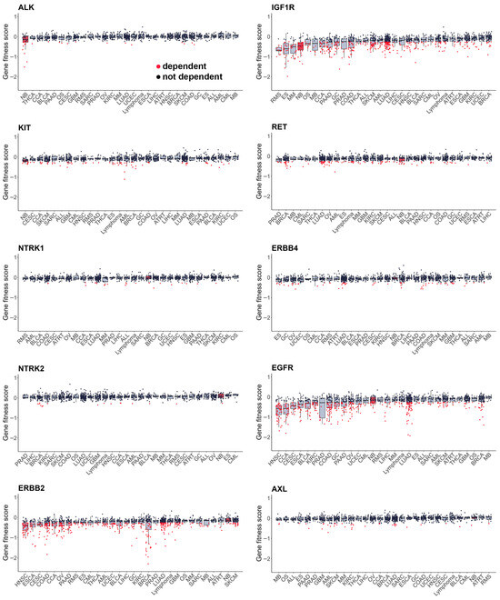 As most RTKi target different sets of kinases, it is hard to estimate and compare their selectivity towards NB cells. To compare selectivity of reviewed compounds we utilised PRISM drug repurposing dataset, which compares drug efficacy at single dose across 859 cancer cell line of different origin (downloaded from DepMap portal https://depmap.org/portal/ (accessed on 10 October 2025)) [243]. Interestingly, crizotinib, a first-generation ALK inhibitor, showed high selectivity towards NB cell lines, while third-generation ALK lorlatinib does not have such selectivity (Figure 3, Table S1). Although lorlatinib is a more selective inhibitor of mutant ALK, crizotinib might display more activity towards NB cells, since most NB cells have ALK overactivation rather than ALK mutations. Crizotinib also inhibits MET [244], which can contribute to its activity against NB cells, where ALK and MET can be simultaneously active. The second drug, which showed the highest selectivity, was IGF-1R inhibitor linsitinib; however, dual ALK/IGF-1R inhibitor AZD3463 showed low selectivity towards NB cells. Among other drugs with high selectivity were drugs that target RET, such as repotrectenib and selpercatinib. Drugs which primarily target MET, such as PHA665752, tivantinib, and cabozantinib, or FGFR inhibitors erdafitinib and pazopanib, showed low selectivity. Surprisingly, although cabozantinib has been shown to inhibit RET phosphorylation in NB cells [236], and showed benefits for maintenance of high-risk NB patients, it did not show selectivity towards NB cell lines. To compare the importance of individual RTKs for NB survival we used DepMap data on gene depletion effects on cell proliferation [21] by combining data for CRISPR and RNAi screens as described in our paper [20] (Figure 4). ALK, IGF1R, and KIT, but not MET or RET, depletion caused reduced NB cell proliferation and had selective effect for NB cells. These data suggest that drugs which selectively target ALK, IGF-1R, or KIT can potentially have more profound effects on NB cell lines. Interestingly, although RET inhibitors repotrectenib and selpercatinib are selective for NB cell lines, RET gene depletion did not have selective effect on NB cells, suggesting that those inhibitors may act through additional targets. Additional inhibition of kinases implicated in drug resistance or ability of cancer cells to adapt, such as TRKs by entrectinib or repotrectinib, MET by crizotinib, and MAPK pathway by regorafenib or sorafenib, may also enhance drug action against NB.