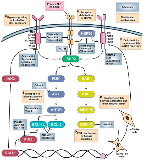 Activation of bypass signalling is the most described mechanism for RTK resistance [247,248] after acquirement of secondary mutations, which rarely happens in NB tumours. Usually, bypass to inhibition of RTK signalling is mediated by activity of other RTKs that activate the same or alternative downstream pathways and promote cell survival (Figure 5a). In vitro studies showed that growth factors such as EPOR, IGF-1, BDNF, NGF, and SCF can reduce efficacy of RTKi in NB cells and compensate for loss of KIT receptor signalling. MET activation has been shown to compensate for inhibition of mutant EGFR, or ALK, ROS1, and RET fusion oncogenes; MET inhibition is beneficial to overcome resistance in NSCLC [249,250]. Although there are no data on impact of MET inhibition on ALK resistance in NB, crizotinib, which is a dual ALK and MET inhibitor, shows high selectivity towards NB cells and was relatively successful in clinical trials. Developed resistance to ALK and pan-TRK inhibitor entrectinib in ALKF1174L NB xenografts was associated with increased TRKB or IGF1R activation [251], and resistance to lorlatinib in NB cells was accompanied by EGFR and HER4 overactivation [252]. EGFR or HER4 inhibition may also be an effective strategy to overcome ALK inhibitor resistance in NB, as EGFR activation by HB-EGF caused adaptive resistance to lorlatinib in NSCLC [253], and pan-HER inhibitor dactomitinib prevented the emergence of drug tolerant persister cells in ALK-positive NSCLC [254].