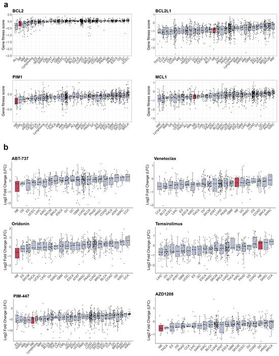 Sensitivity of cancer cell lines to apoptosis inducers. (a) Gene fitness scores combined from CRISPR and RNAi screens from DepMap database. (b) Cell number change in log2 after treatment with RTK inhibitors from PRISM database. Cell lines grouped by primary tumour type, neuroblastoma cells marked in red. Median values and lower and upper quartile are shown; each dot represents a cell line. CCA—cholangiocarcinoma, BLCA—bladder urothelial carcinoma, BRCA—breast invasive carcinoma, OS—osteosarcoma, CESC—cervical squamous cell carcinoma and endocervical adenocarcinoma, COAD—colon adenocarcinoma, UCEC—uterine corpus endometrial carcinoma, ESCA—esophageal carcinoma, ES—Ewing sarcoma, GBC—gallbladder cancer, GC—stomach adenocarcinoma, GBM—glioblastoma multiforme, HNSC—head and neck squamous cell carcinoma, KIRC—kidney renal clear cell carcinoma, LIHC—liver hepatocellular carcinoma, LUAD—lung adenocarcinoma, MB—medulloblastoma, SKCM—skin cutaneous melanoma, MM—multiple myeloma, NB—neuroblastoma, OV—ovarian serous cystadenocarcinoma, PAAD—pancreatic adenocarcinoma, PRAD—prostate adenocarcinoma, ATRT—atypical teratoid rhabdoid tumour, RMS—rhabdomyosarcoma, SARC—sarcoma, SCC—squamous cell carcinoma, THCA—thyroid carcinoma.