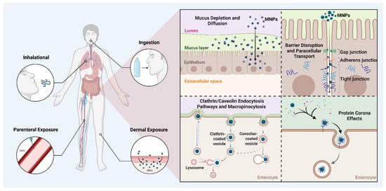 Overview of micro- and nanoplastic (MNP) exposure routes and uptake mechanisms. MNPs reach internal/colon tissues primarily through ingestion, inhalation, dermal, or parenteral routes. Within epithelial barriers, MNPs can cross through mucus disruption, tight junction alterations, or active endocytosis pathways (clathrin/caveolin-mediated and macropinocytosis). Protein corona formation further influences their cellular interaction, uptake efficiency, and potential toxicity. Created with BioRender.com.