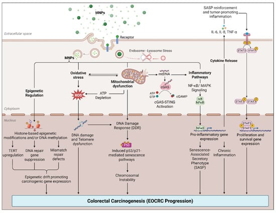 Mechanistically, MNP exposure is known to trigger oxidative stress, inflammation, and cellular senescence across diverse systems. A recent narrative review summarizes how MNP uptake by immune and structural cells leads to ROS production, DNA and protein damage, and pro-inflammatory signaling pathways that intersect with aging-related processes [75]. Placental explant studies further confirm that PS MPs cause time-dependent cytotoxicity, elevate levels of mitochondrial and total superoxide anions and hydrogen peroxide, reduce antioxidant defenses, and induce oxidative damage (e.g., elevated malondialdehyde and carbonylated proteins) [73]. Taken together, these findings strongly suggest that prenatal MNP exposure compromises telomere integrity, potentially inducing a “pre-aged” cellular phenotype from birth. Since telomere shortening is a key driver of genomic instability and tumorigenesis, such early-life molecular perturbations may represent a biologically plausible, but as yet unproven, contributor to EOCRC susceptibility later in life.