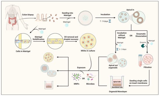 - Apical-Out organoids: Direct Luminal Exposure Models. A major innovation in organoid-based toxicology is the development of apical-out organoids, in which the luminal (apical) surface is oriented outward toward the culture medium (Figure 3). This configuration enables direct exposure of the epithelium to suspended MNPs, closely mimicking oral ingestion and supporting dynamic, high-resolution functional analyses [76]. In a recent study, apical-out small-intestinal organoids were combined with fluorescence lifetime imaging microscopy (FLIM) to track nanoparticle interactions in real time. Using pristine PMMA and polystyrene nanoparticles (<200 nm), the authors demonstrated topology-dependent uptake, with apical-out models showing faster and more uniform internalization compared to conventional basal-out organoids. FLIM further enabled ‘lifetime barcoding,’ allowing discrimination of particle types and mapping of interaction sites within the tissue microenvironment. Functionally, both short—(24 h) and long-term (72 h) exposures disrupted mitochondrial membrane potential and increased CXCL-8 secretion, reflecting early epithelial stress in intact 3D tissue. Together, these findings establish apical-out colorectal organoids as a highly powerful platform for modeling luminal exposure scenarios relevant to EOCRC [77]. While apical-out culture has been widely applied to tumor-derived and small-intestinal organoids, it is also feasible in normal human colon organoids, with careful handling in suspension to preserve epithelial polarity and viability. CRC-derived organoids are generally more robust in this configuration, facilitating broader experimental applications [76,78].