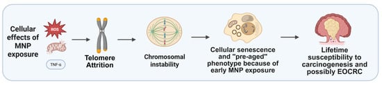 Hypothetical cascade of MNP effects. After MNP exposure telomere-related changes could drive chromosomal instability and cellular senescence, possibly predisposing to early-onset colorectal cancer. Created with BioRender.com.
