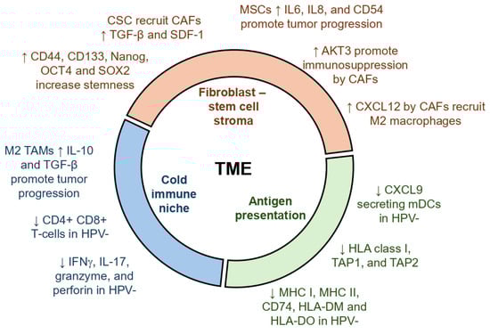 Figure 1. Role of various cells in the tumor microenvironment in HNSCC. Key events are broadly classified into three groups: stem cells and fibroblasts, immune cells, and antigen presentation. Up arrows indicate events upregulated and down arrows indicate events downregulated in the TME, which promote tumor progression.