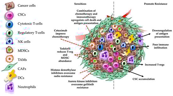 Resistance to immunotherapy is an area of active research in HNSCC. As mentioned earlier, HPV infection status plays a key role in defining the immune signature in the TME of HNSCC. HPV-positive patients generally present better tumor infiltration of immune cells, which is associated with better outcomes. However, HPV-negative tumors display an immunosuppressive environment characterized by poor tumor infiltration and the inadequate antigen presentation associated with lower mutational burden. Furthermore, TME also consists of higher immunosuppressive cells, such as T-regs and MDSCs [101]. Tumor galectin-1 (Gal-1) levels were inversely related to immune checkpoint inhibitor (ICI) treatment in HNSCC patients [118]. Gal-1 promoted immunosuppression by inhibiting T-cell infiltration. Likewise, the inhibition of Gal-1 resensitized the tumors to immunotherapy and significantly reduced tumor growth when combined with radiation therapy. To overcome the lack of antigen presentation, a combination of cisplatin and anti-PD1 immunotherapy was used under the rationale that cisplatin may enhance antigen presentation in the TME by inducing immunogenic cell death [119]. This study showed that sublethal doses of cisplatin in combination with anti-PD1 delayed tumor growth in animal models. Together, this suggests that the induction of immunogenic cell death and inhibiting molecules like Gal-1 may improve immunotherapy in HNSCC. M-I treatment displays robust anti-tumor effects in mouse HNSCC xenograft tumors by affecting the TAM population [120]. M-I treatment promotes a switch from M2 to M1 phenotype, as demonstrated by an inhibition of Arg1 expression. Furthermore, the study presented a reduction in the expression of myeloid cell differentiation factor Sfln4 and neutrophil chemoattractant Cxcl3. M-I treatment also downregulated the expression of PD1, PD-L1, and FoxP3 in the tumor, suggesting a strong candidate for immunotherapy in HNSCC [120]. Some key mechanisms promoting therapeutic resistance and strategies used to overcome resistance are listed in Table 3. Furthermore, a schematic representation of these mechanisms is depicted in Figure 2. Overall, poor immune infiltration with increased immune suppressive mechanisms such as an increase in T-reg and MDSC population and decrease in antigen presentation in addition to the accumulation of CSCs promote resistance to chemotherapy and immunotherapy. However, targeting these mechanisms using a combination of chemotherapy, immunotherapy, and/or targeted therapy such as cetuximab, tadalafil, and aurora kinase inhibitors have exhibited significant improvements in therapeutic outcomes.