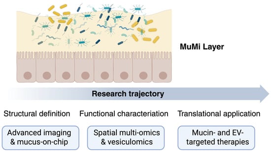 Despite significant advances in the characterisation of mucins, mucosa-associated microbiota and extracellular vesicles, the MuMi layer remains a largely unexplored frontier of mucosal biology. Future research must address the mechanistic, methodological and translational gaps that currently limit our understanding of this complex ecosystem. Figure 2 summarises our view of the conceptual evolution of MuMi-layer research, from structural definition to translational application.