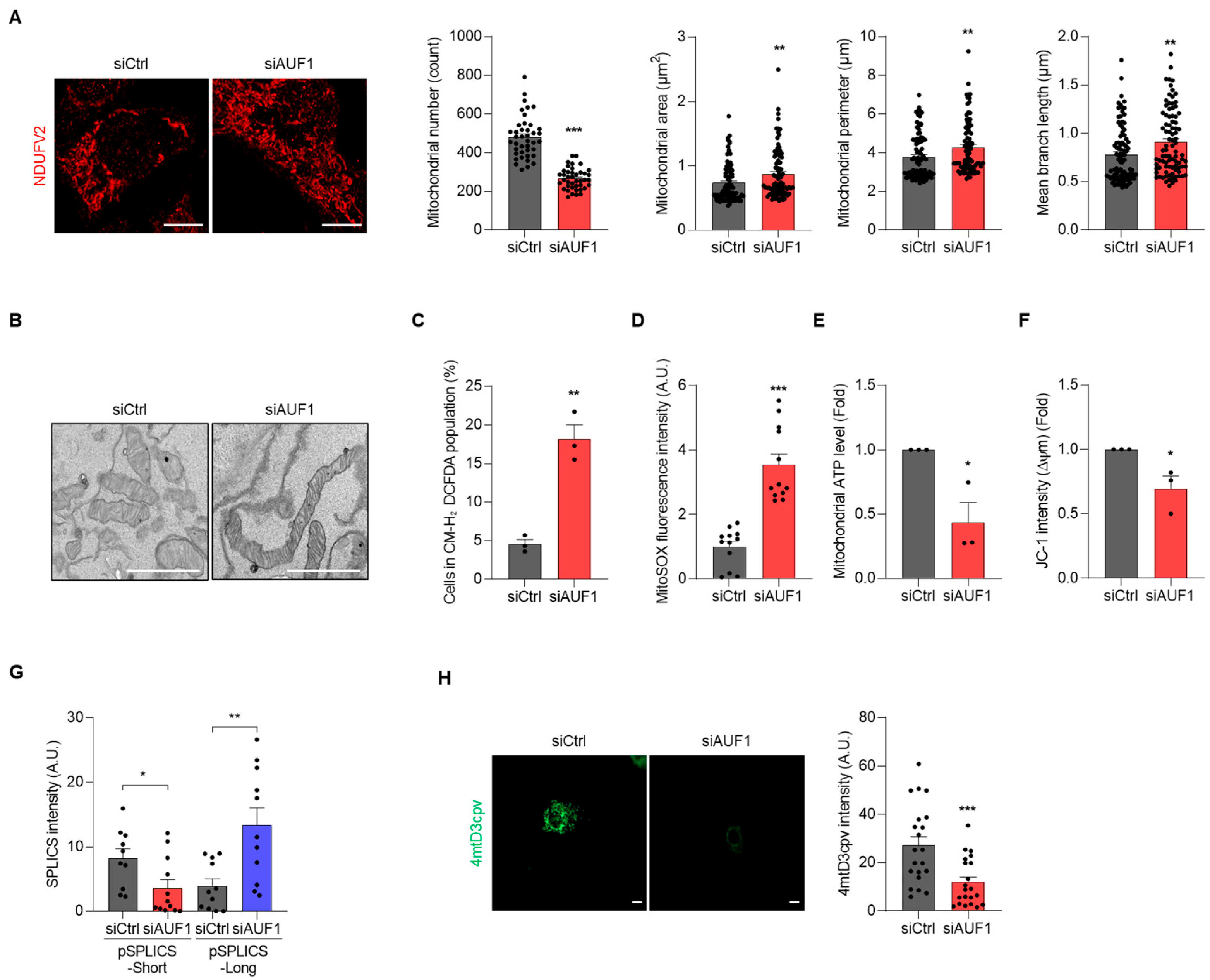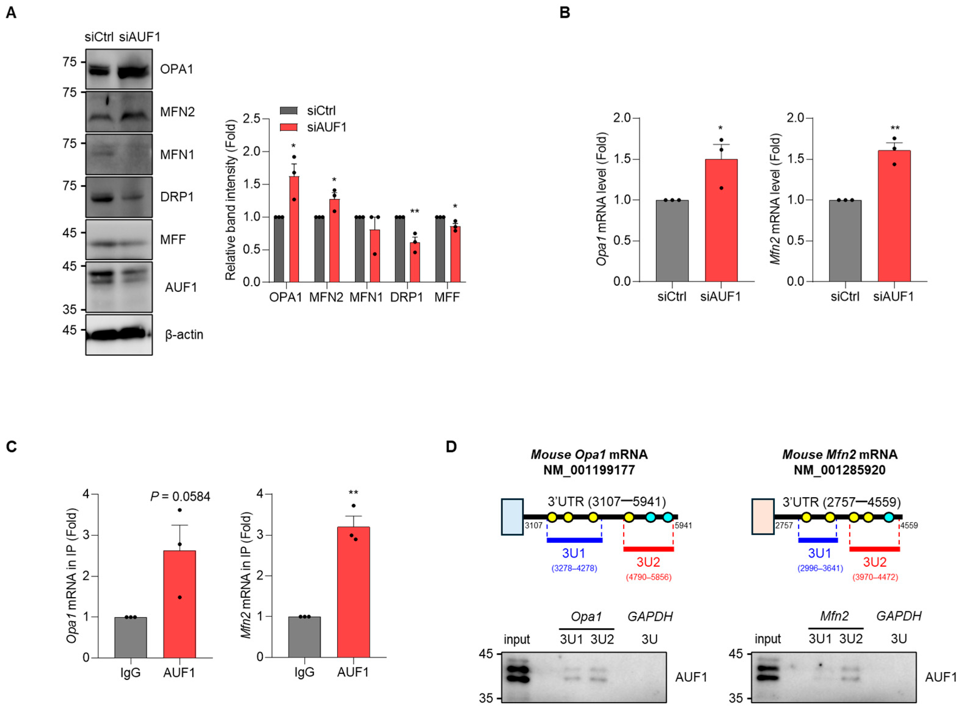 3.5. AUF1 Binds Mitochondrial Fusion Factor mRNAs and Contributes to Fusion-Dominant Structure