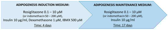 To date, no single, universal, and fully optimized protocol for differentiating ADSCs or other mesenchymal stem cells (MSCs) into BAT cells has been established that could be regarded as a “gold standard”. Current differentiation protocols primarily rely on the use of rosiglitazone or indomethacin as the key differentiating agents. However, these protocols vary considerably in media composition, concentrations of differentiating factors, and culture duration (Supplementary Table S1) [15,16,17,18,19,20,21,22,23,24,25,26,27,28,29,30]. The majority of studies are conducted using commercial cells or primary cells derived from animals. Research involving primary human ADSCs remains limited.