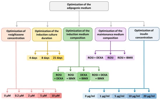 The baseline differentiation protocol was subjected to numerous modifications (Supplementary Table S2). Optimization of the differentiation process toward beige adipocytes was performed using rosiglitazone (Figure 2) and indomethacin. Additionally, the study evaluated the spontaneous differentiation capacity of ADSCs into adipocytes and the individual effects of specific differentiation factors on ADSC morphology.