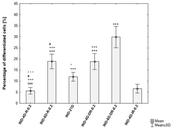Differentiation efficiency of ADSCs under varying induction durations and maintenance media, based on analysis of microscopic images. IND-4D-R-0.2/IND-8D-R-0.2—ADSCs induced for 4 or 8 days, then maintained with 0.2 µM rosiglitazone + 10 µg/mL insulin, IND-21D—ADSCs induced for 21 days, IND-4D-DR-0.2/IND-8D-DR-0.2—ADSCs induced for 4 or 8 days, then maintained with 0.2 µM rosiglitazone + 10 µg/mL insulin + 1 µM dexamethasone. Statistical analysis was performed using ANOVA followed by Tukey’s post hoc test; OOO p < 0.001 compared to IND-8D-R-0.2, # p < 0.05 compared to IND-21D, ^ p < 0.05, ^^^ p < 0.001 compared to IND-4D-DR-0.2, +++ p < 0.001 compared to IND-8D-DR-0.2, *** p < 0.001 compared to IND-4D-IR-0.2.