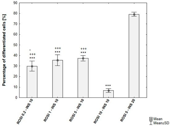 Differentiation efficiency of ADSCs under varying rosiglitazone and insulin concentrations, based on analysis of microscopic images. ROSI 0.2-INS10/ROSI 1-INS10/ROSI 5-INS10/ROSI 10-INS10—ADSCs induced for 8 days, then maintained with rosiglitazone at 0.2, 1, 5, or 10 µM, 10 µg/mL insulin, and 1 µM dexamethasone. ROSI 5-INS20—ADSCs induced for 8 days, then maintained with 5 µM rosiglitazone, 20 µg/mL insulin, and 1 µM dexamethasone. Statistical analysis was performed using ANOVA followed by Tukey’s post hoc test; ^ p < 0.05 compared to ROSI 5-INS10, +++ p < 0.001 compared to ROSI 10-INS10, *** p < 0.001 compared to ROSI 5-INS20.