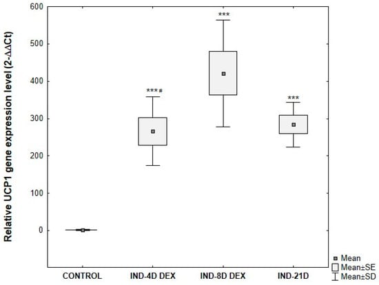 Comparative analysis of changes in relative UCP1 gene expression at the mRNA level, normalized to the average GAPDH gene expression, depending on the duration of the differentiation-inducing culture of ADSCs. ADSCs were cultured for 4 days (IND-4D DEX), 8 days (IND-8D DEX), or 21 days (IND-21D) in induction medium supplemented with 10 μg/mL insulin, 0.2 μM rosiglitazone, 1 μM dexamethasone, and 500 μM IBMX followed by culture without IBMX until day 21 post-T0. Fold change was calculated relative to control using the 2^−ΔΔCT method. Statistical analysis was performed using ANOVA followed by Tukey’s post hoc test, *** p < 0.001 compared to the control, # p < 0.05 compared to IND-8D DEX.