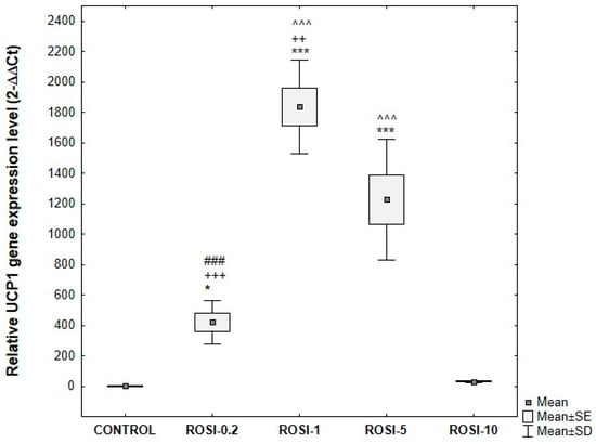 UCP1 gene expression at the mRNA level, normalized to the average GAPDH gene expression in ADSCs exposed to varying concentrations of rosiglitazone, compared with control cells. ADSCs were differentiated for 8 days in induction medium supplemented with 10 μg/mL insulin, 1 μM dexamethasone, 500 μM IBMX, and rosiglitazone at the following concentrations: 0.2 μM (ROSI-0.2), 1 μM (ROSI-1), 5 μM (ROSI-5), and 10 μM (ROSI-10) followed by culture without IBMX until day 21 post-T0. Fold change was calculated relative to control using the 2^−ΔΔCT method. Statistical analysis was performed using ANOVA followed by Tukey’s post hoc test; * p < 0.05, *** p < 0.001 compared to control, ### p < 0.001 compared to ROSI-1, ++ p < 0.005, +++ p < 0.001 compared to ROSI-5, ^^^ p < 0.001 compared to ROSI-10.