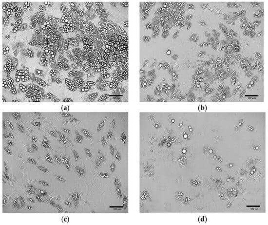 Extending the duration of the induction culture from 4 (Figure 4b) days to 8 days (Figure 4c) resulted in the increased number of cells exhibiting the phenotype of beige adipocytes. Nevertheless, the use of the induction medium throughout the entire culture period (21 days post T0) initially led to the formation of numerous lipid droplets and changes in cell morphology (Figure 4d). However, over time, a gradual cell death was observed. Exclusion of the induction medium prevented the differentiation of ADSCs into adipocytes (Figure 4a).