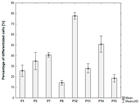 The statistical analysis was conducted using Statistica software 13.3 (StatSoft, Tulsa, OK, USA). The normality of data distribution was assessed with the Shapiro–Wilk test, and homogeneity of variances was verified using Levene’s test. For RT-qPCR data, one-way analysis of variance (ANOVA) was used to evaluate differences in gene expression between the studied groups, followed by the post- hoc Tukey’s test. To determine statistically significant differences in the dependent variables before and after differentiation, a paired-samples t-test was applied. Statistical significance was defined as p < 0.05. Quantitative analysis of microscopic images (percentage of the area occupied by differentiated cells) was also performed using one-way ANOVA with Tukey’s post hoc test.