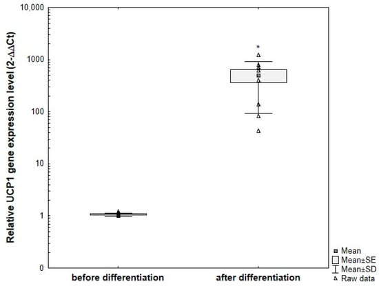 Expression analysis of the UCP1 gene in the studied groups was carried out using RT-qPCR with a Light Cycler 480 sequence detector (Roche, Basel, Switzerland). As endogenous controls the gene encoding glyceraldehyde-3-phosphate dehydrogenase (GAPDH) were used. The GoTaq Probe 1-Step RT-qPCR System (Promega, Madison, WI, USA) was utilized to perform the reaction. TaqMan molecular probe sets labeled with 6-carboxyfluorescein (FAM) and primers complementary to the analyzed genes were used: UCP1 (ID: Hs01084772_m1) and GAPDH (ID: Hs99999905_m1) (Thermo Fisher Scientific, Waltham, MA, USA). Each sample was analyzed in two technical replicates, and the average value was used for analysis. Gene expression levels of UCP1 were determined using the relative 2^−ΔΔCT method. RT-qPCR analysis of UCP1 gene expression was performed on selected ADSC samples before and after differentiation toward beige adipocytes.
