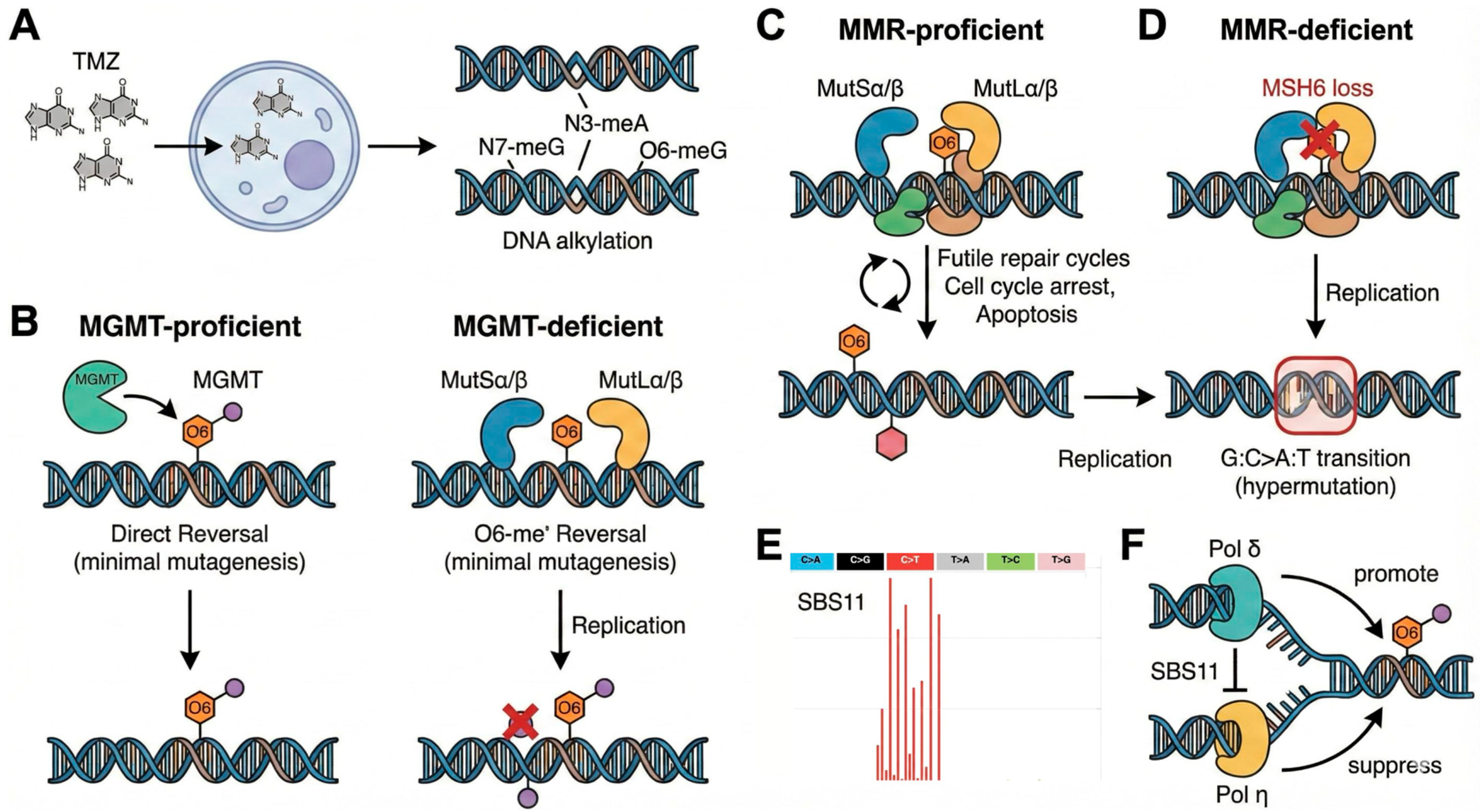 - Sanyal, M.R.; Sugiyama, T. Biochemical Reconstitution of Temozolomide-Induced Mutational Processes. J. Biol. Chem. 2025, 301, 110676. [Google Scholar] [CrossRef]