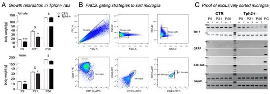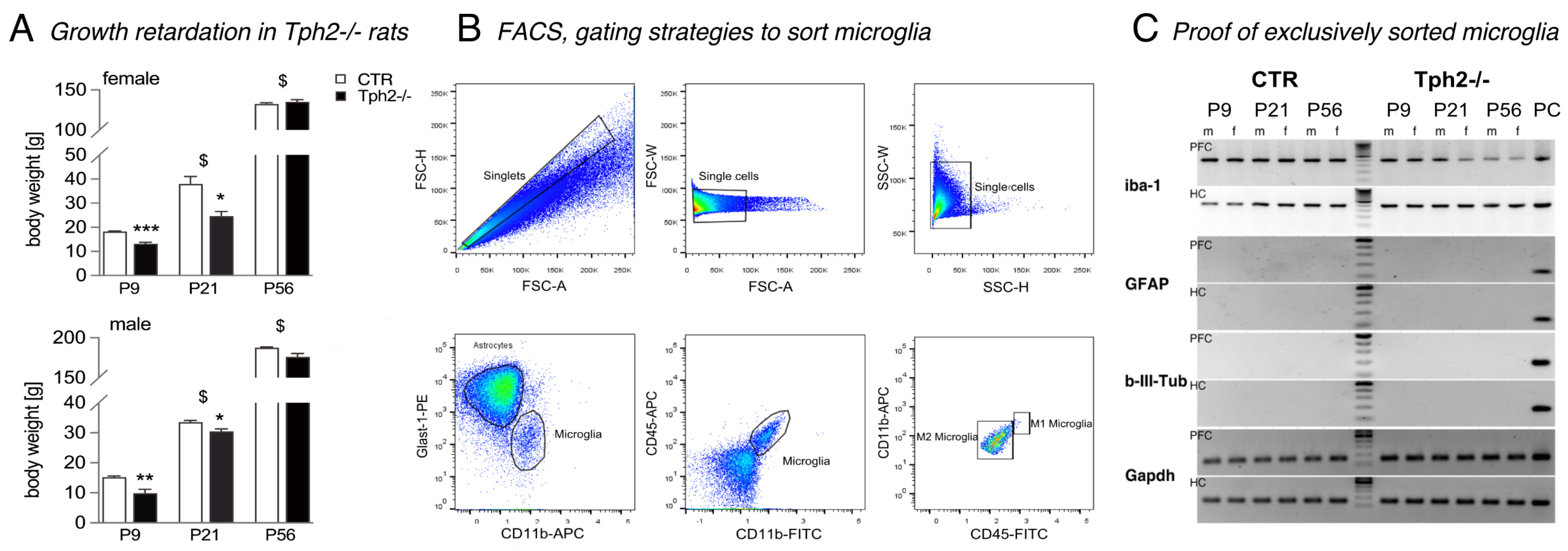 3.1. Increased Proportion of Microglia in Tph2−/− Rats at P9
