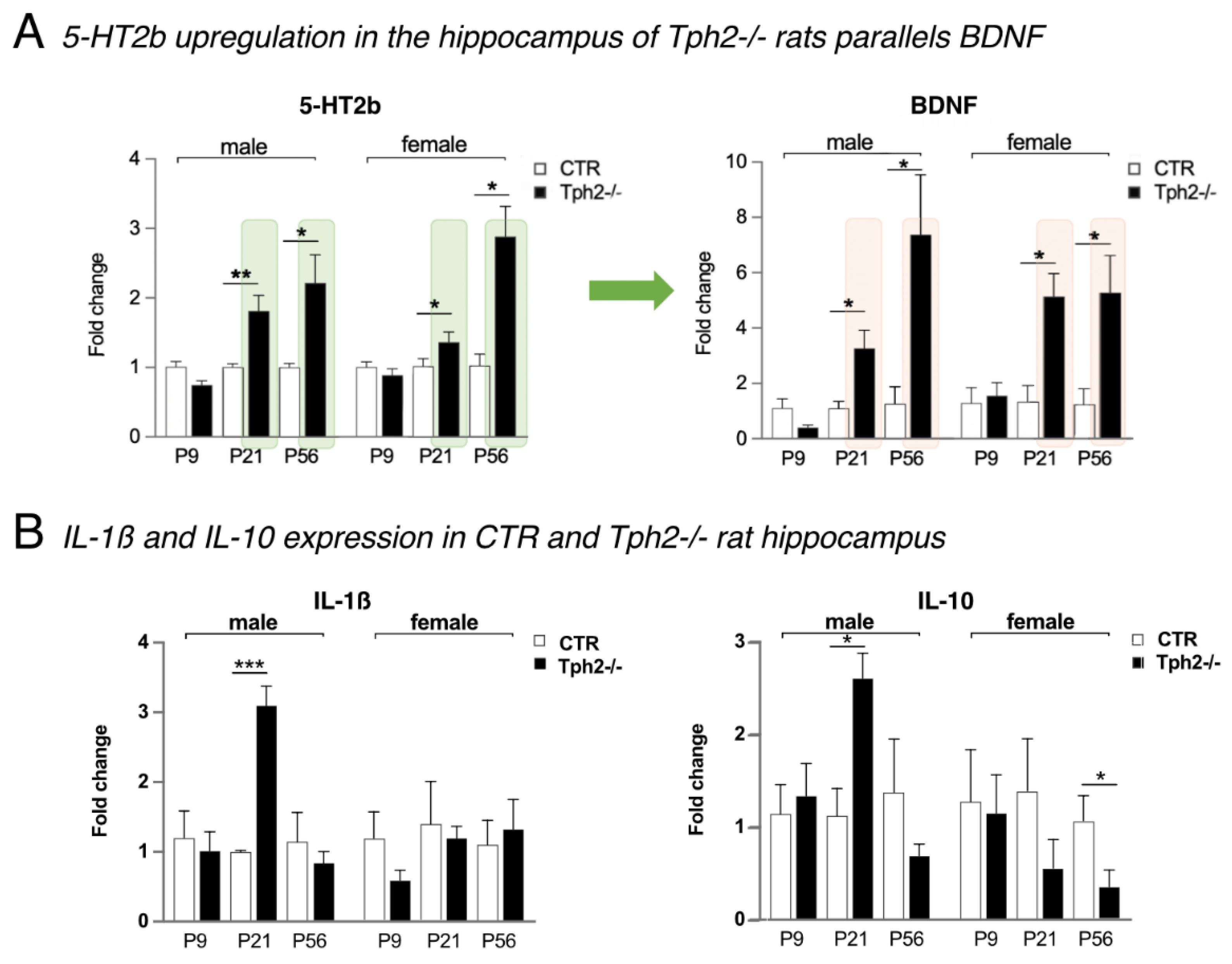 - Upregulated microglial 5-HT2b in Tph2−/− rats parallels BDNF levels.