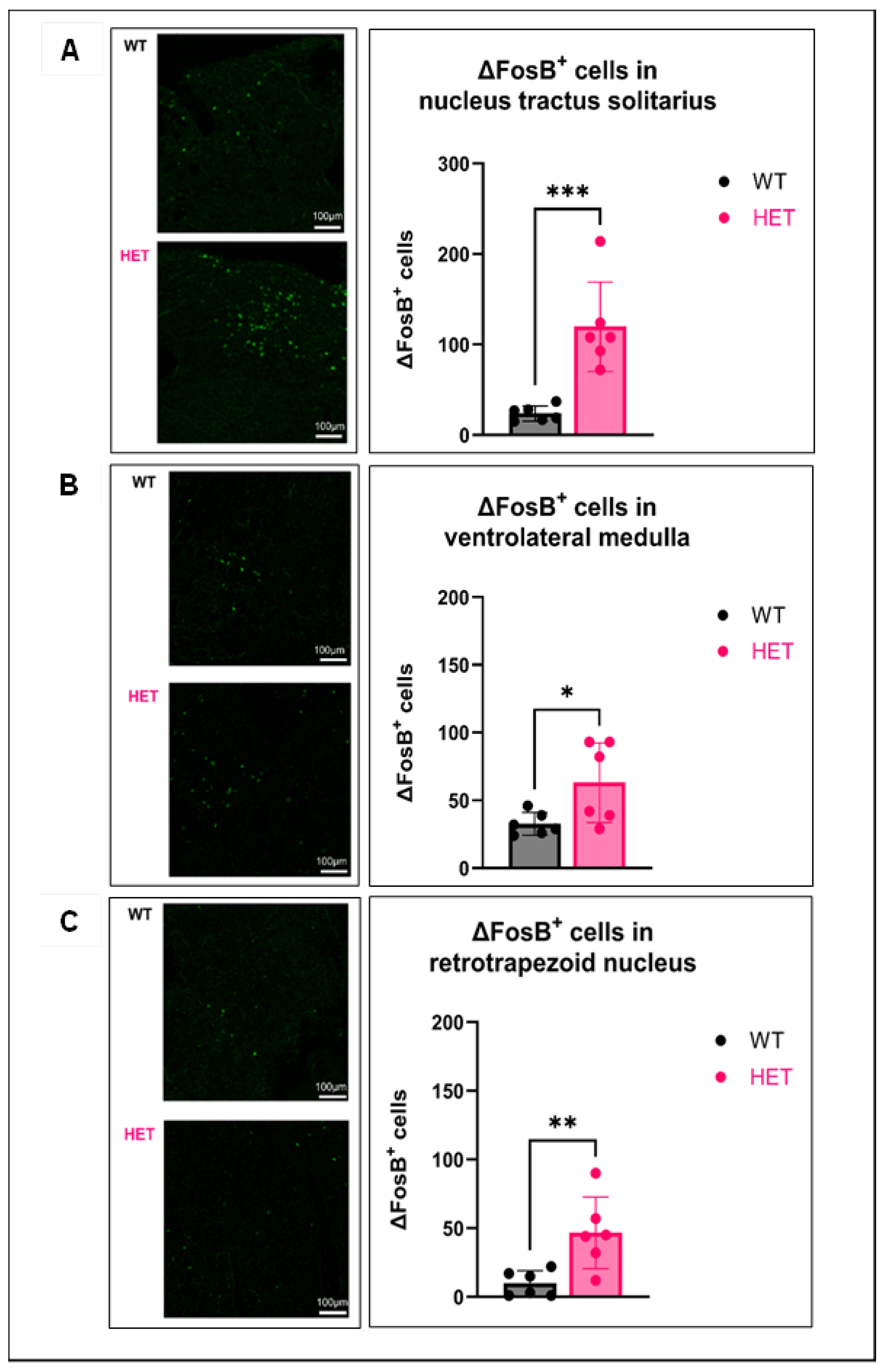 3.2. Respiratory Nuclei Are Chronically Active in Several Brainstem Nuclei of HETs