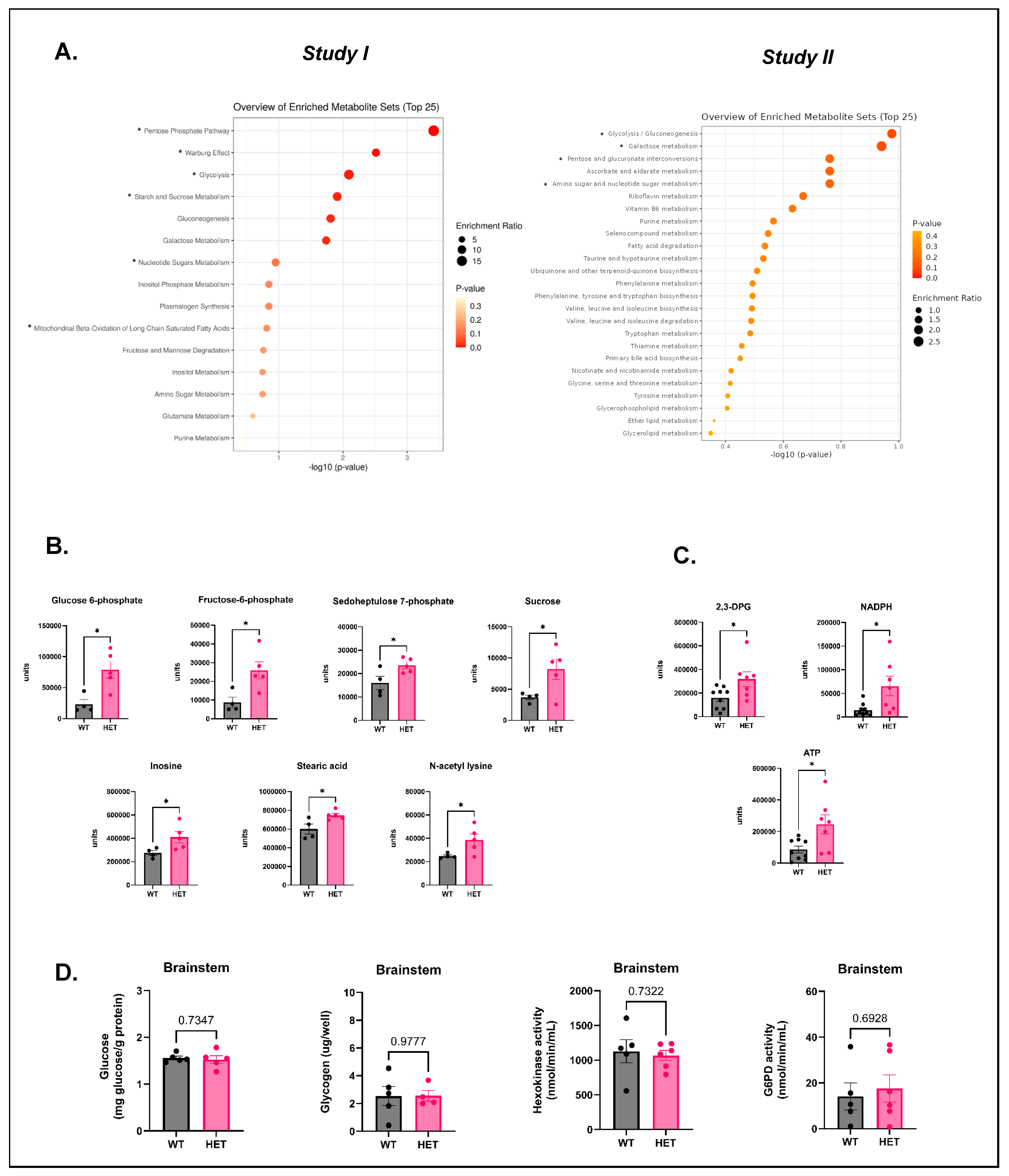 3.3. Metabolomic Analyses (Studies I and II) Reveal an Overall Increase in Glycolytic and Energy Metabolism in the Brainstem of P20–30 HETs