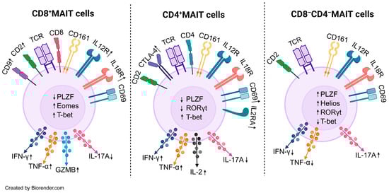 - Kaur, R.; Xie, D.; Pradhan, A.; Mehanna, N.; Li, K.; Aubé, J.; Rosati, B.; Carlson, D.; Lee, C.Y.; Vorkas, C.K. CD4+ mucosal-associated invariant T cells express highly diverse T cell receptors. J. Immunol. 2025, 214, 3260–3272. [Google Scholar] [CrossRef]