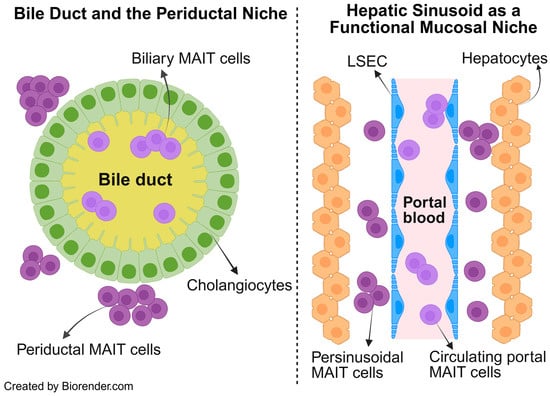 We return to the basic principles of the liver comprising a true mucosal surface in the form of bile ducts, and functional mucosa in terms of hepatocytes coming into direct contact with portal blood in the sinusoids. Each of these mucosal surfaces are surrounded by their respective mucosal-adjacent niches. The bile ducts are surrounded by the periductal niche, and the hepatic sinusoids are surrounded by the perisinusoidal niche. MAIT cells have been detected in bile duct brushings obtained during invasive endoscopic procedures to examine the biliary tree (e.g., endoscopic retrograde cholangiography (ERC) which directly samples the biliary mucosa [50]. These biliary MAIT cells can be considered to be truly mucosal as they sample antigens in bile and stand as sentinels in preventing microbial injury from bile sources. However, MAIT cells have also been detected in the periductal niche where they are unlikely to encounter bile-derived antigens and can be considered periductal MAIT cells.
