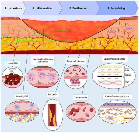 Figure 1. Schematic representation of the four phases of wound healing—Hemostasis, Inflammation, Proliferation, and Remodeling—illustrated within a cross-sectional wound bed. Representative monogenic and polygenic disorders impairing each phase are annotated in their corresponding regions. Descriptions are listed in order of appearance from left to right. Hemostasis: Hemophilia (FVIII and FIX deficiency) impairing fibrin clot formation. Inflammation: Obesity and diabetes mellitus promoting chronic inflammation with macrophage and lymphocyte predominance; leukocyte adhesion deficiency types I–III causing defects in neutrophil adhesion and migration. Proliferation: Peripheral arterial disease and hypertension reducing perfusion due to arterial stenosis; sickle cell disease characterized by polymerized HbS and sickled RBCs; thalassemia causing hemolysis and abnormal RBC morphology. Remodeling: Epidermolysis bullosa causing dermal–epidermal separation, as represented by the symbols “****”; Ehlers–Danlos syndrome disrupting collagen and elastin structure. Abbreviations: FVIII, factor VIII; FIX, factor IX; DM, diabetes mellitus; RBC, red blood cell; HbS, hemoglobin S; PAD, peripheral arterial disease; HTN, hypertension. Created in BioRender. Mueller, S. (2025) https://BioRender.com/t221sbh (accessed on 24 November 2025).