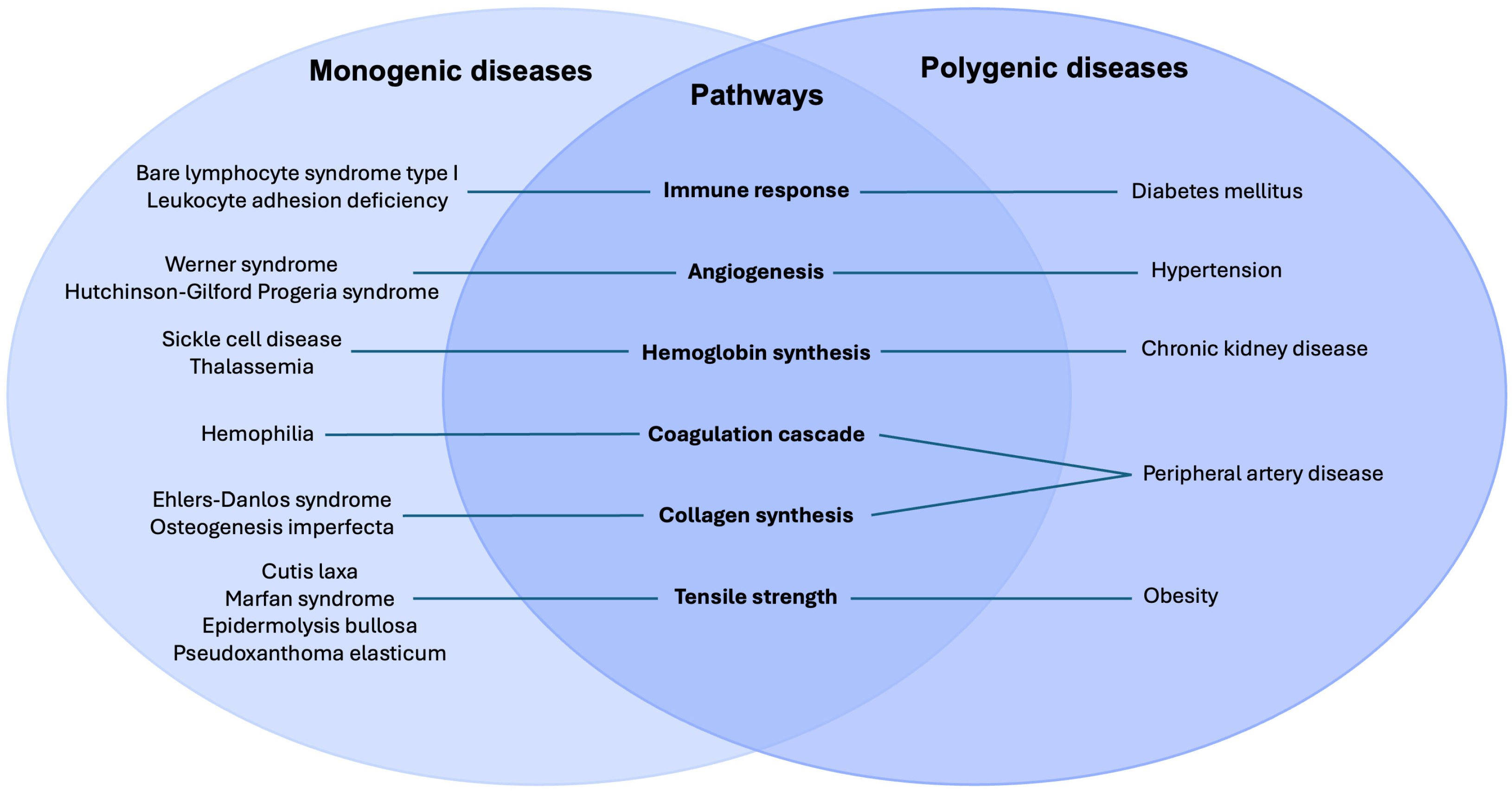 - Monogenic and polygenic disorders—despite differing genetic architectures—converge on shared downstream failures in hemostasis, inflammation, cellular proliferation, and extracellular matrix remodeling.