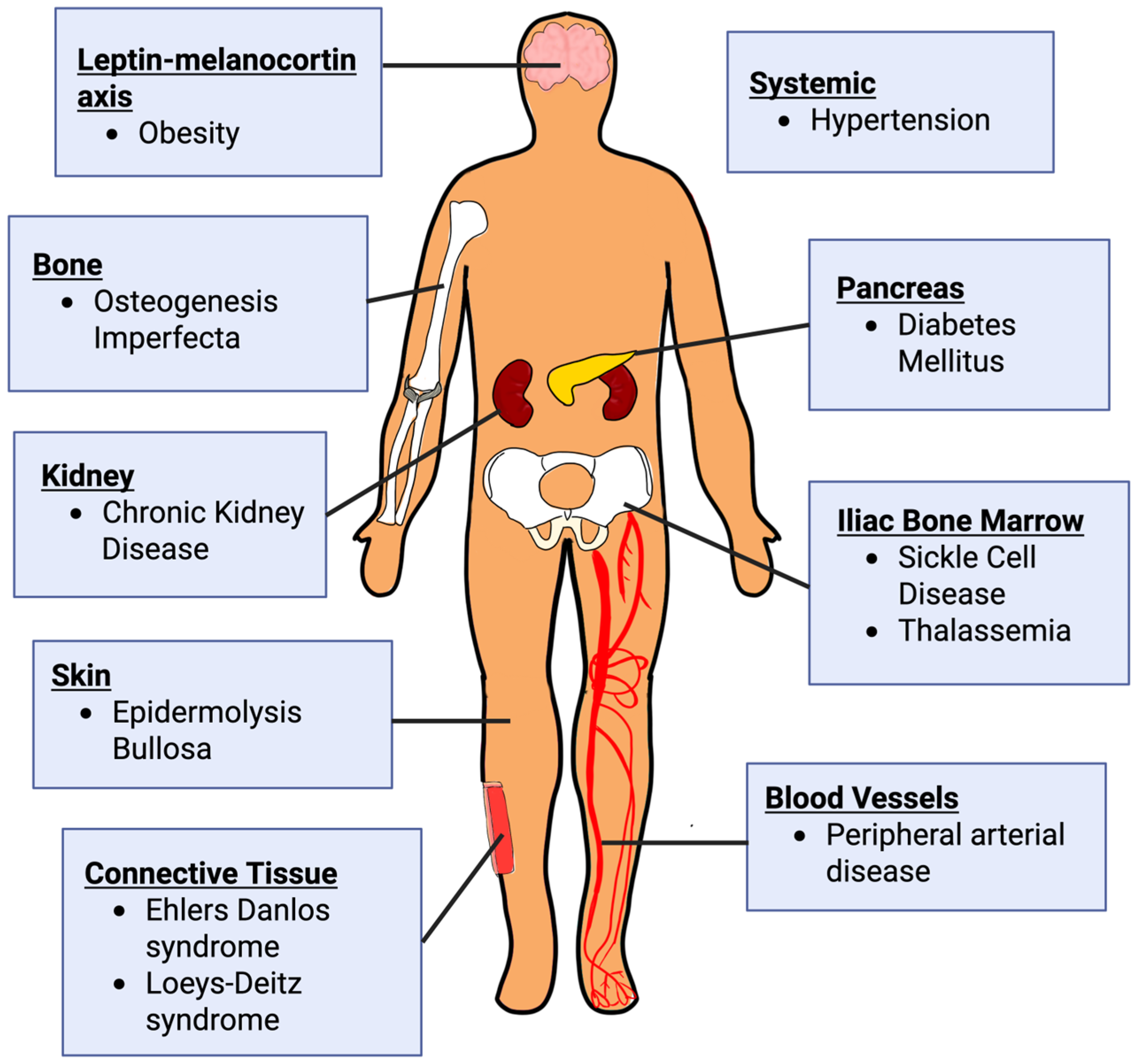 | Ehlers-Danlos Syndrome [28] | COL5A1/2 | Type V collagen; provides support to the dermis, tendons, and muscles; critical in Type I collagen fibrillogenesis | Strong in vitro, in vivo, and clinical studies |