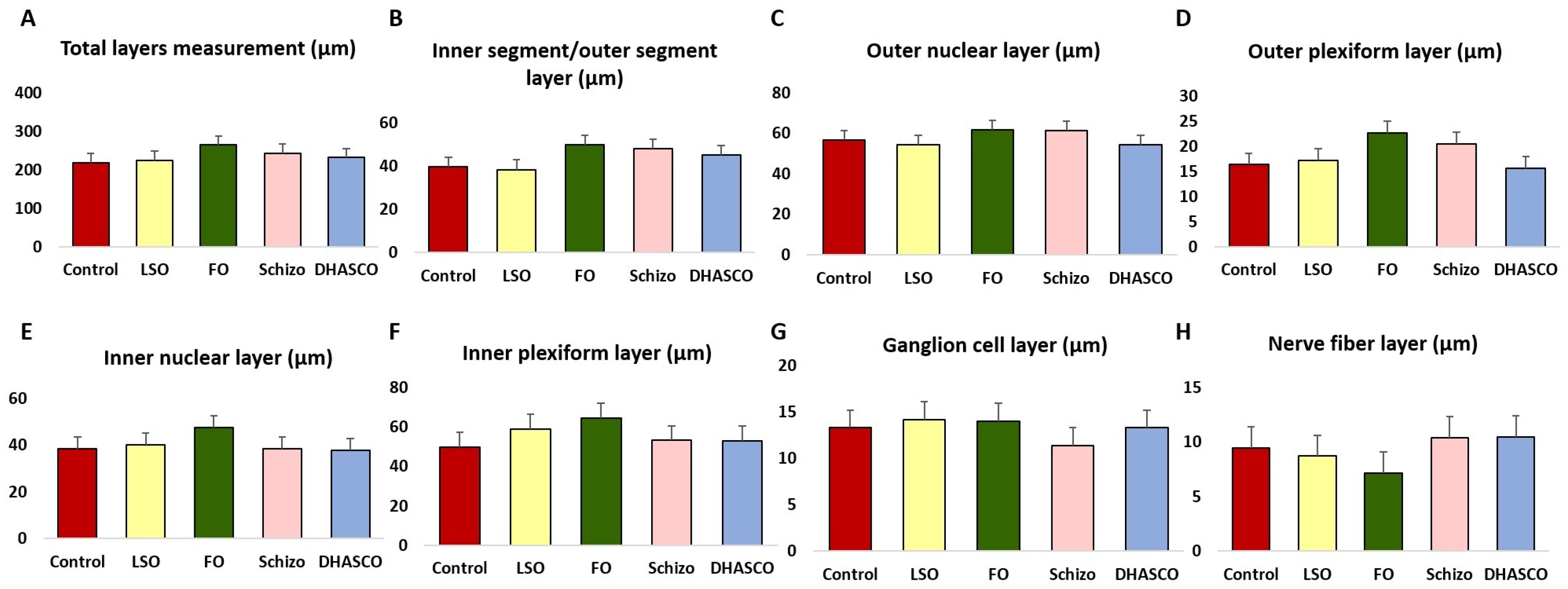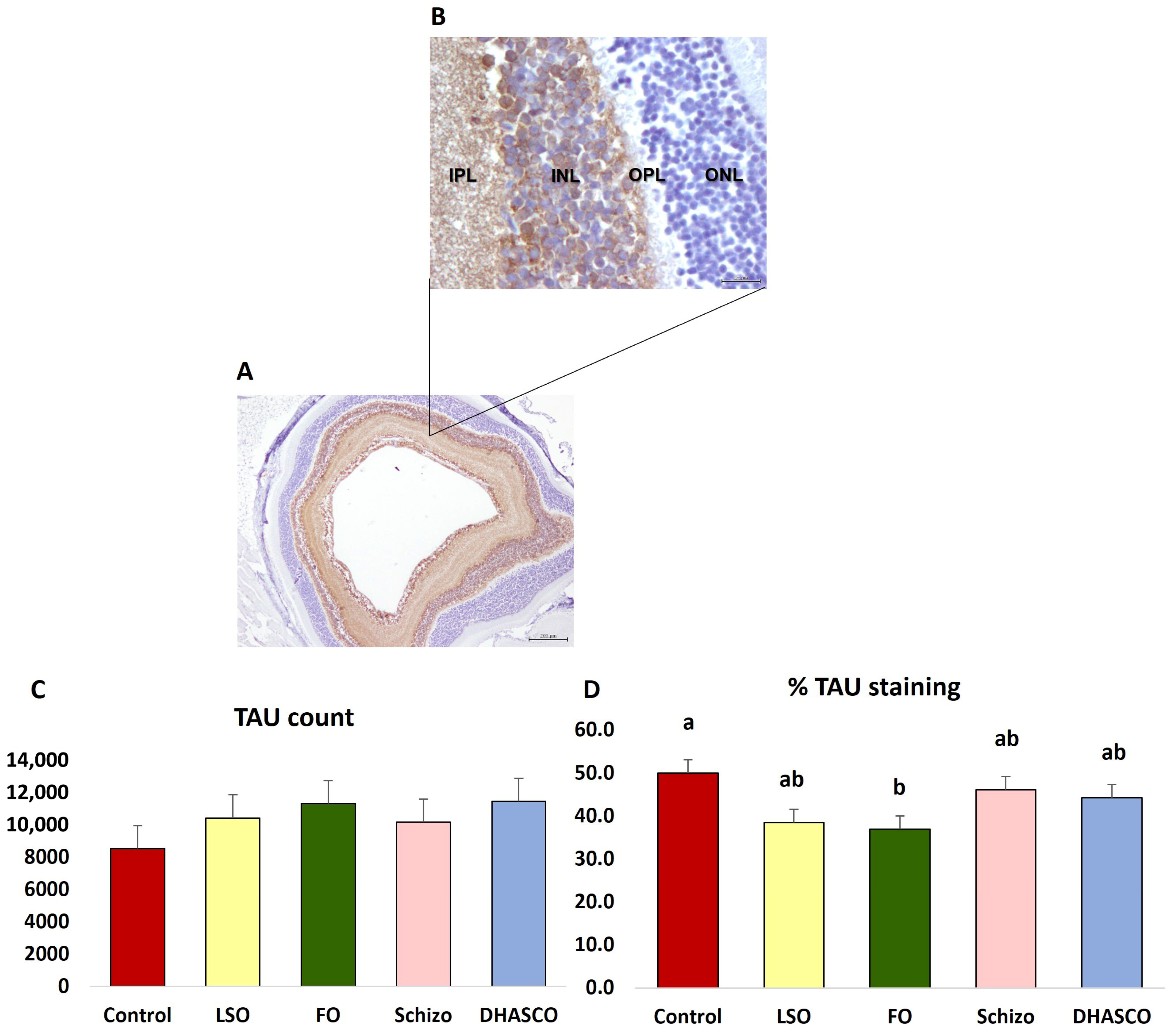 - The neuroprotective effects of DHA supplementation in 5xFAD mice were found in the retina, from both fish oil and DHASCO commercial oil, concerning the retinal layer thickness, TAU protein aggregates, and retinal ganglion cell layer density, respectively.