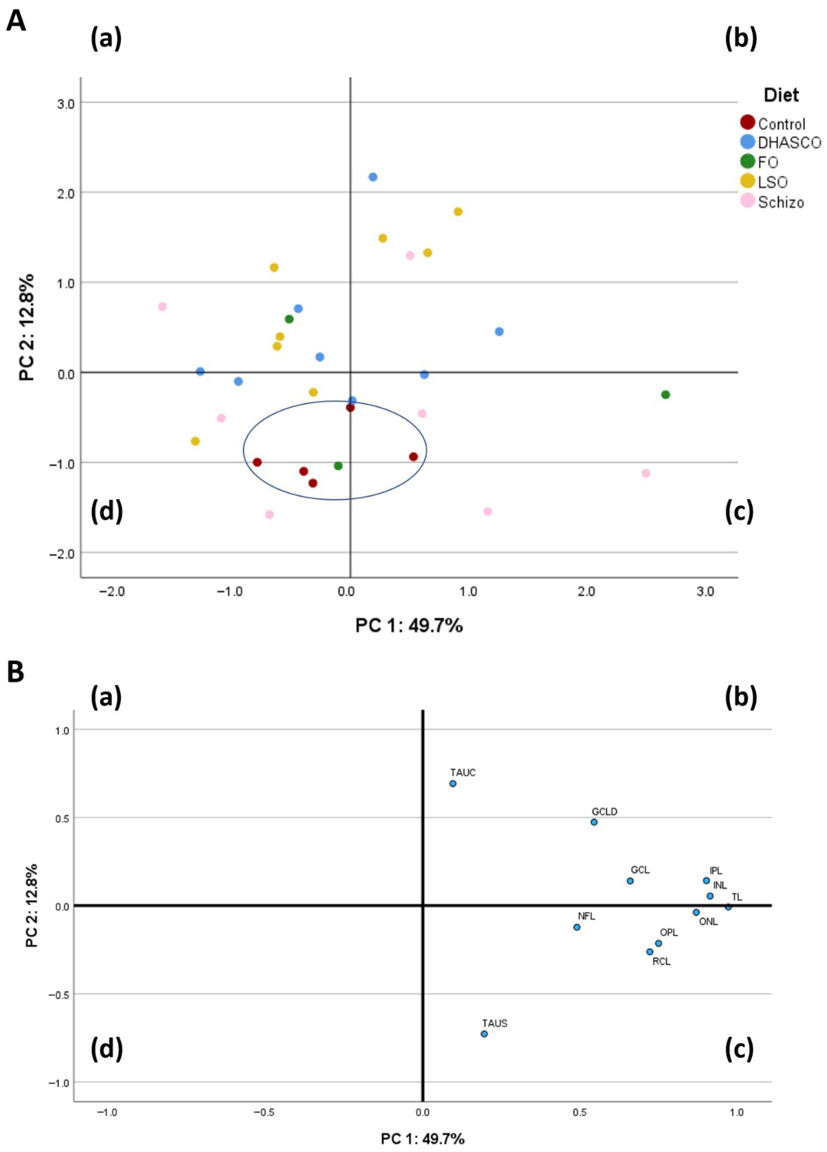 3.6. Principal Component Analysis (PCA) Using Retinal Layer Thickness, GCL Density, and TAU Immunohistochemistry in the Retina of 5xFAD Mice Fed DHA-Enriched Diets