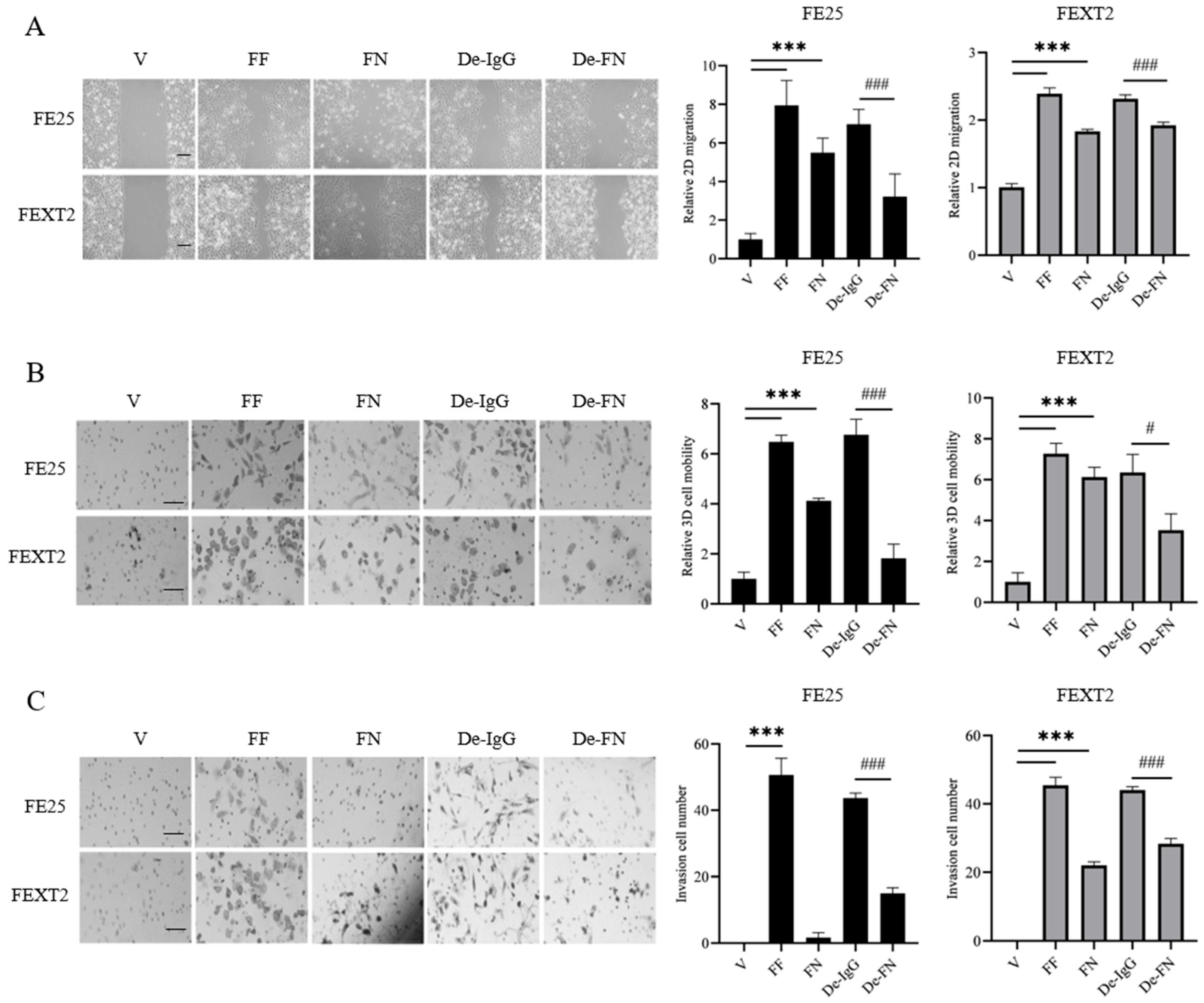 3.2. Depletion of FN from FF Partially Compromises Migration and Invasion