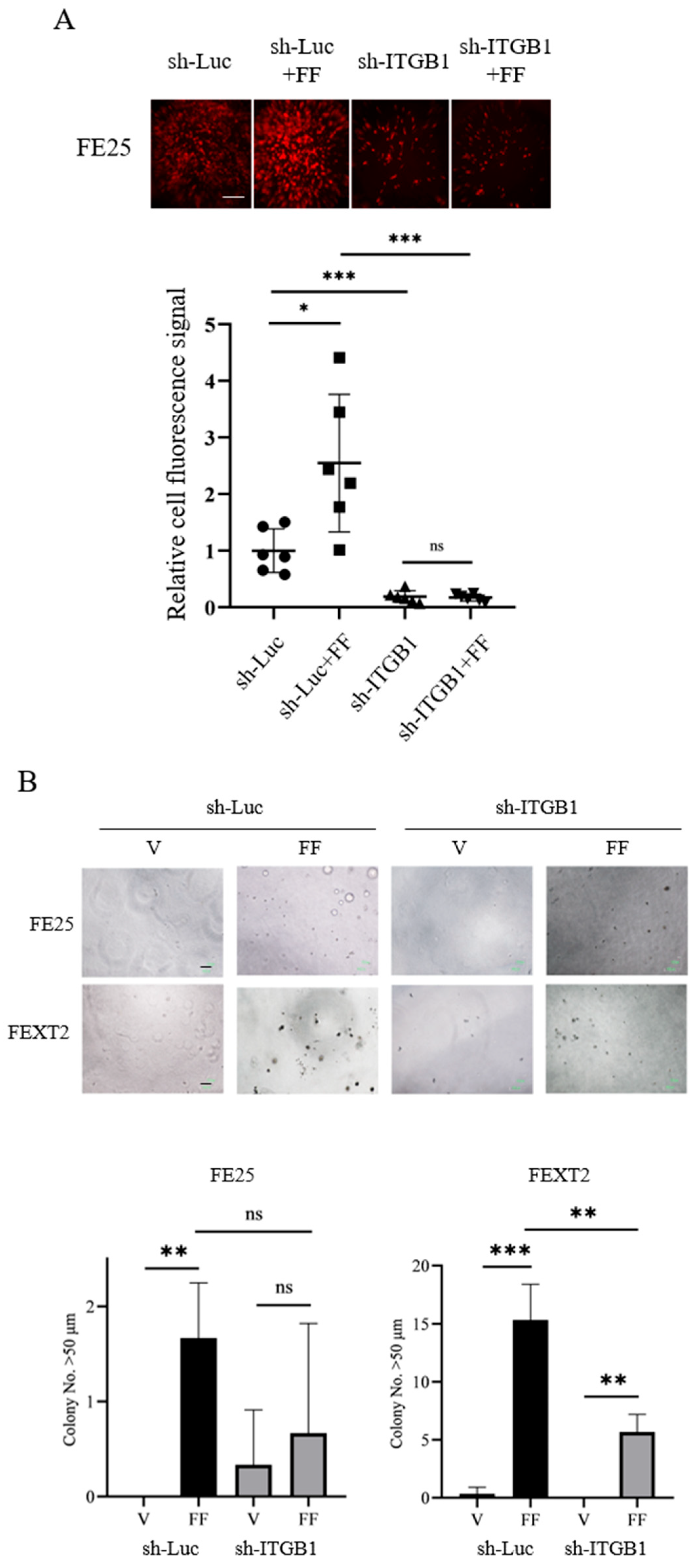 | Cell Line | FE25 sh-Luc | FE25 sh-ITGB1 | FEXT2 sh-Luc | FEXT2 sh-ITGB1 | ||||